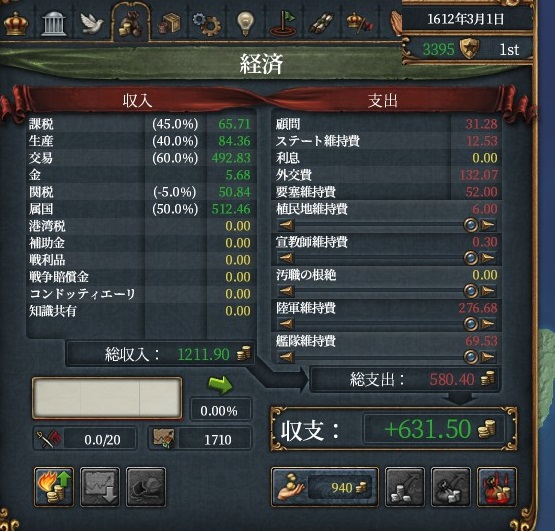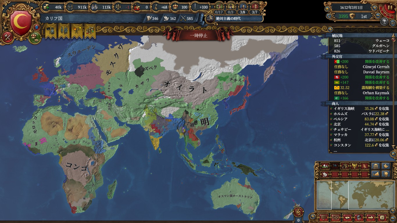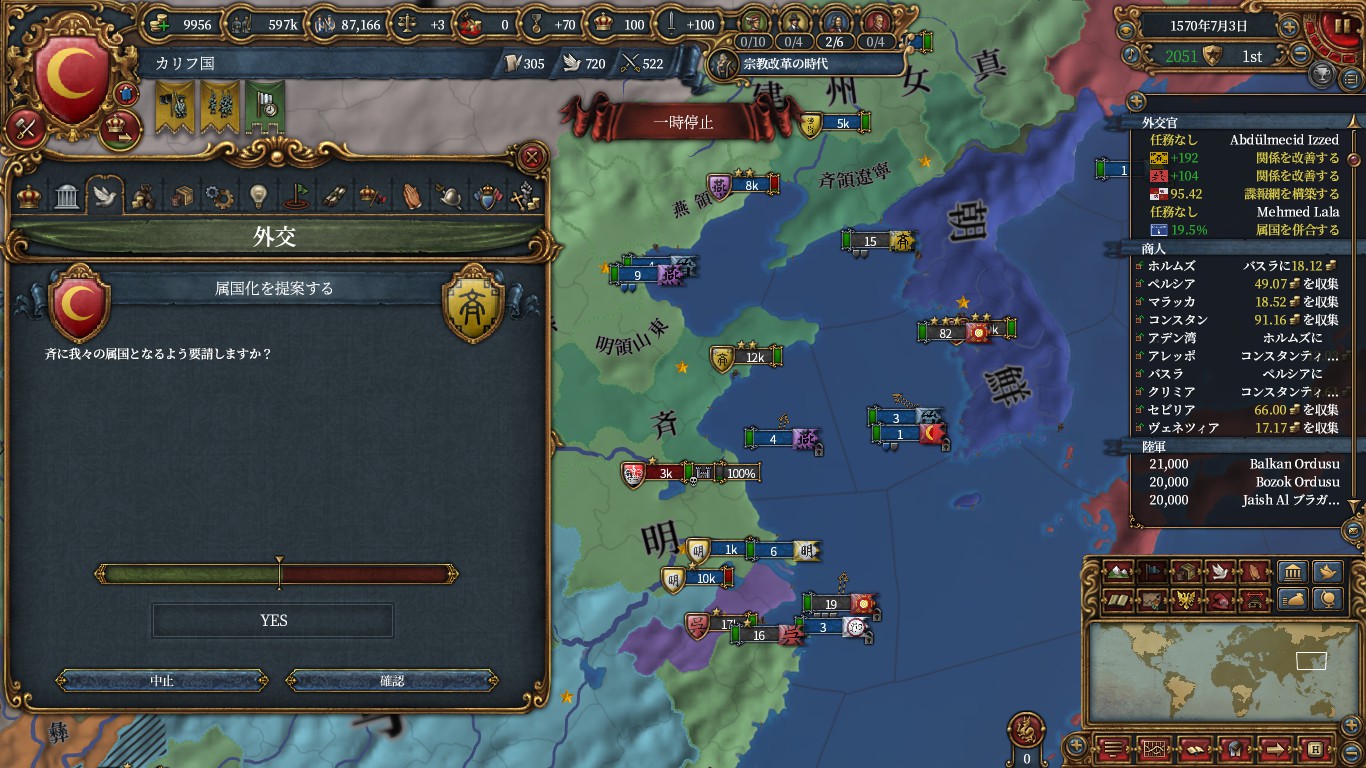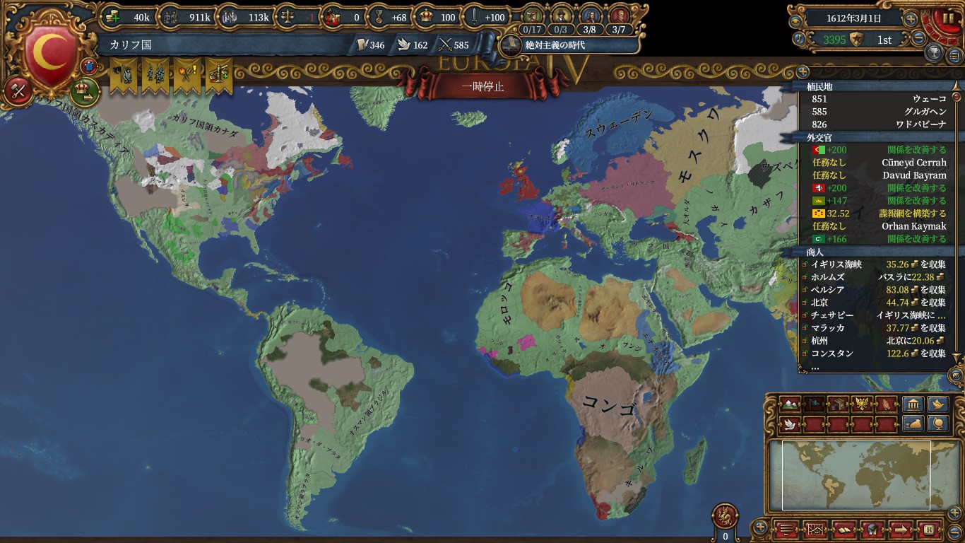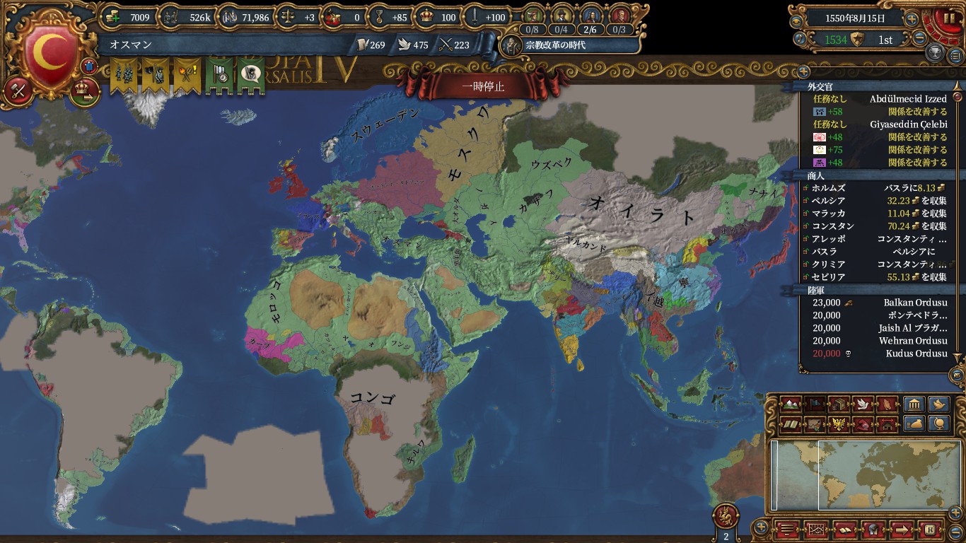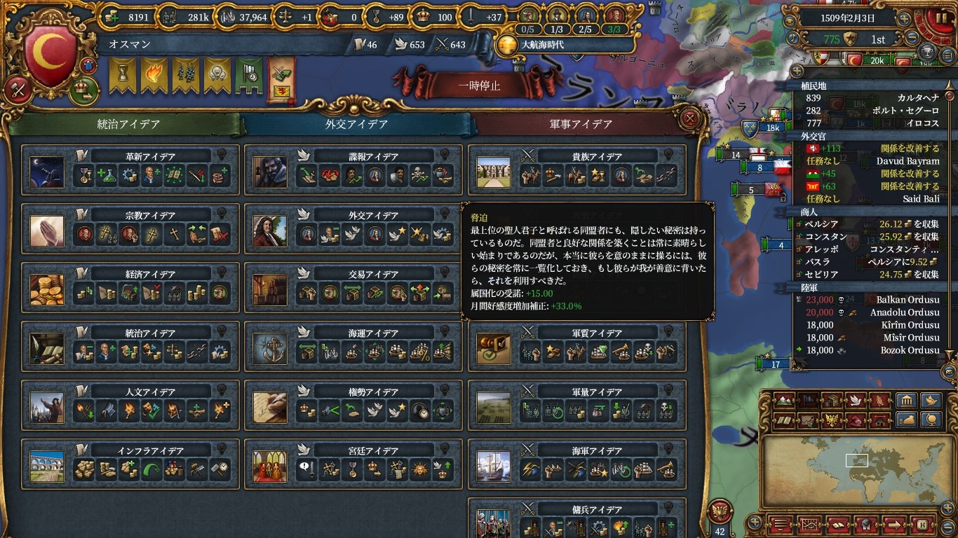 大航海時代で国難解決に必要なペルシア州を確保し、ある程度基盤が作れているため、戦争はあまりせずに植民と外交属国化で拡張していきます。
