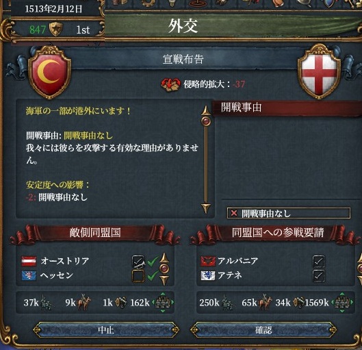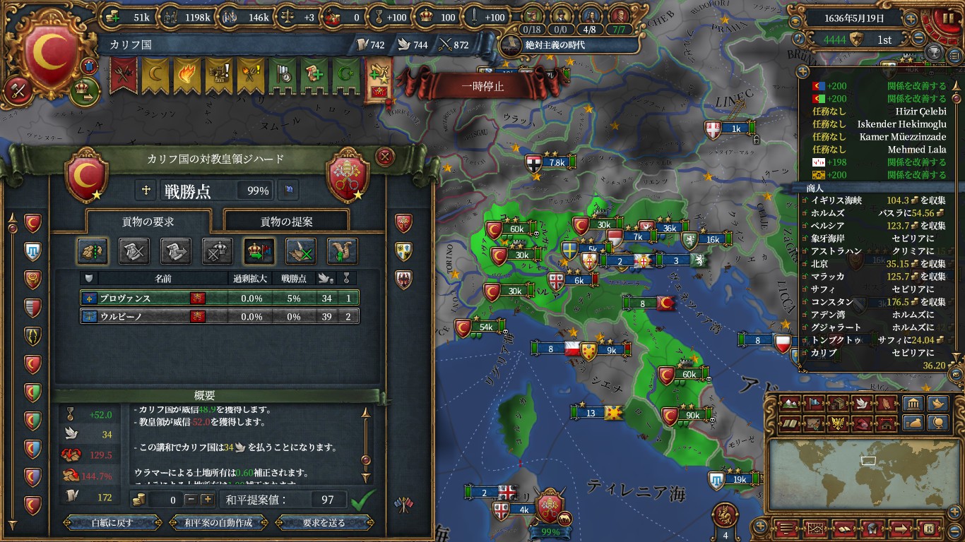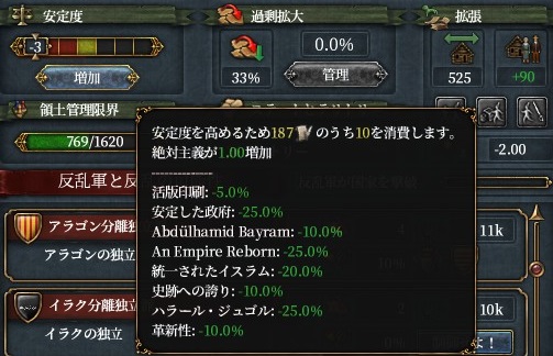 進捗が1%しかないと、発生に10年掛かるので属国から土地没収して過剰拡大を25%以上にしたり、宗教を強制((国難発生後はコアエヤレトからエヤレトにしてLDを帳消し)してLDを挙げたりして、進捗を3%にしました。