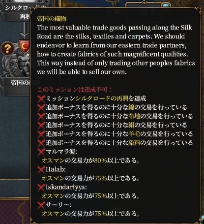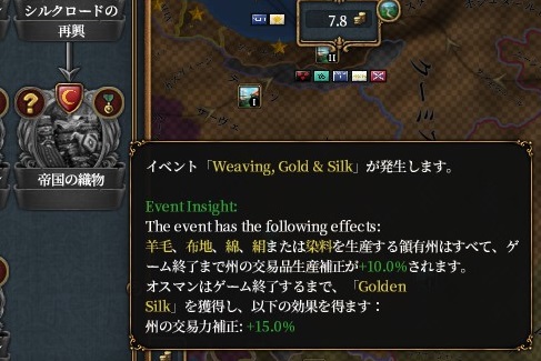 最後のミッションでは、織物系の交易品ボーナスを受け取り、対象産物の領有州の交易品生産補正+10%されます。