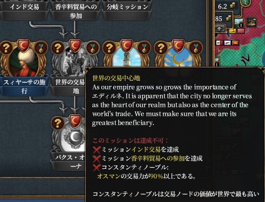このミッションでは自国のホームノード(交易首都のあるノード)の交易力90%とノード価値が最も高い、そして月収500が必要です。