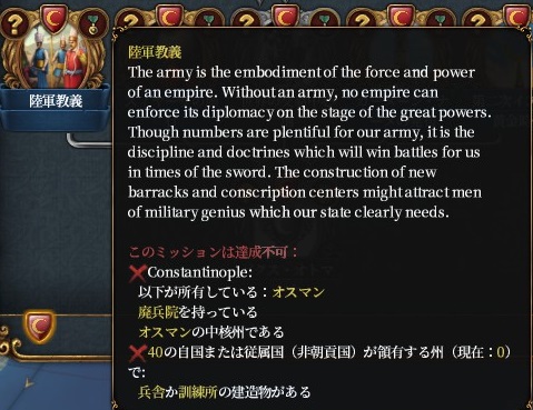 コンスタンティノープルに廃兵院を建て、属国込みで兵舎か訓練所計40州建てると達成。