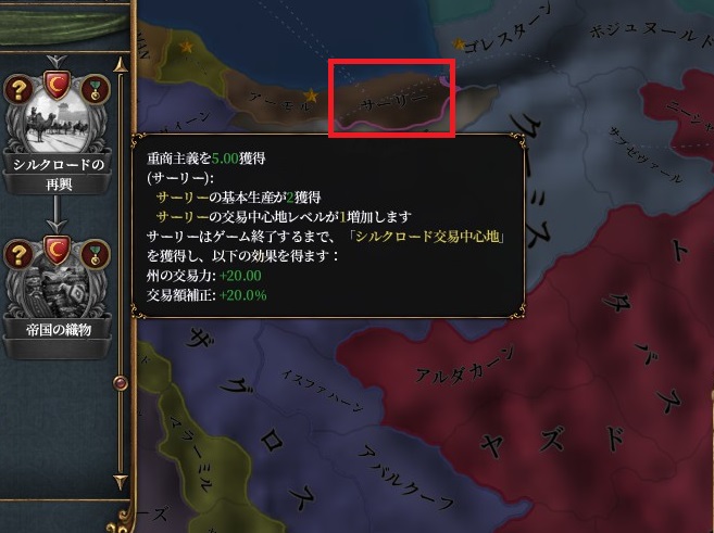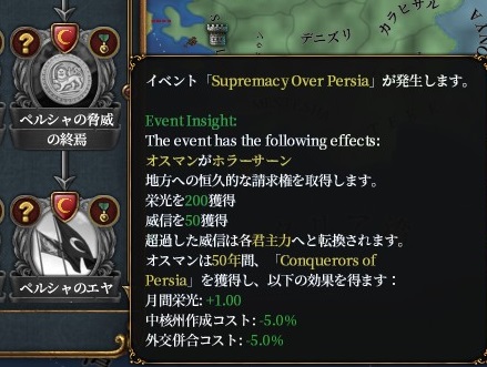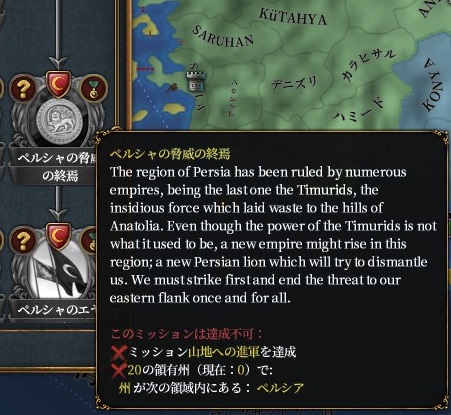 それに続くミッションではペルシア20州(直轄)保有でホラーサーン地方とコア化/併合コスト-5%が50年貰えます。永続ならなぁ。