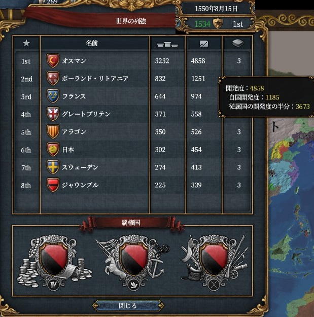 これらのミッション達成と、属国込みで開発4000以上、列強1位、覇権国などで統治効率+5%が貰えます。