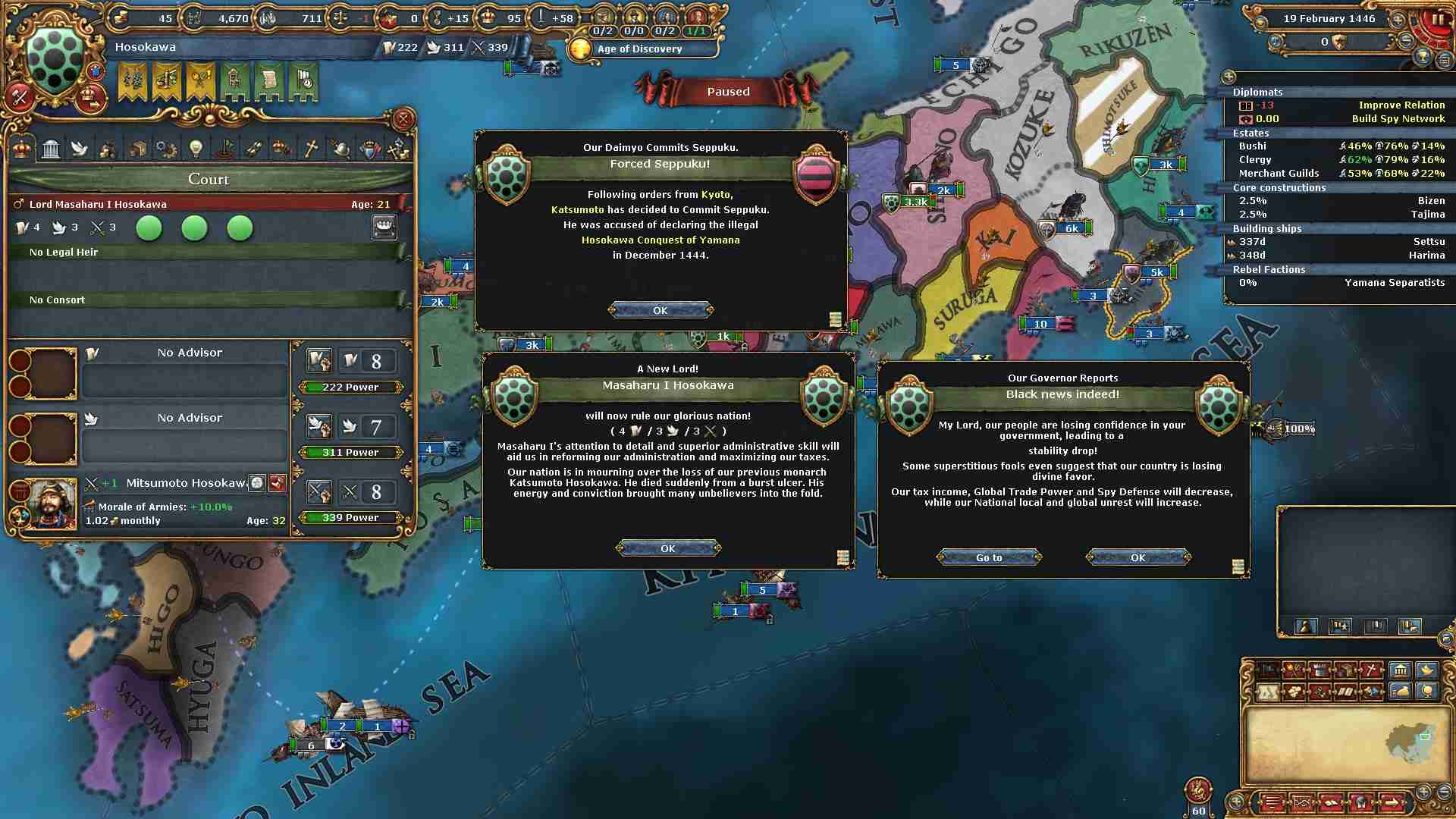 細川家の足利家に対する独立欲求が50未満になっていることと拡大の結果ほぼ確実にこの段階で切腹をさせられます。憶えてろよ!