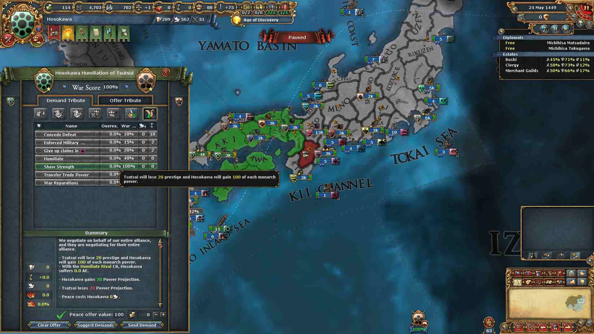 武威を見せつけることによる和平条約により、各君主点を100得られました。