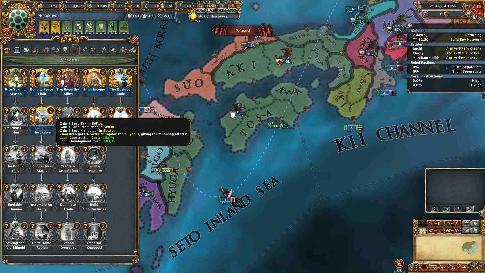 この時点で首都摂津の開発度アップと開発コスト減少効果が得られるミッションが取れました。