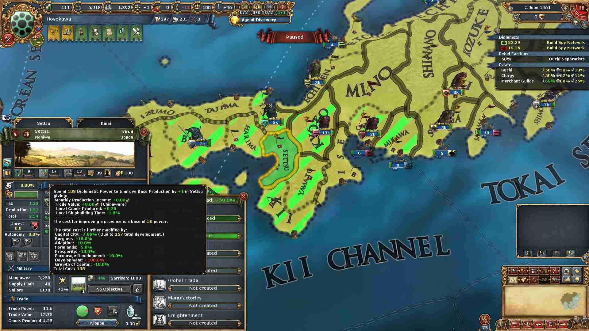通常は制度受容のためには2000点以上の君主点を開発に費やす必要がありますが、半分以下に抑えることが出来ました。