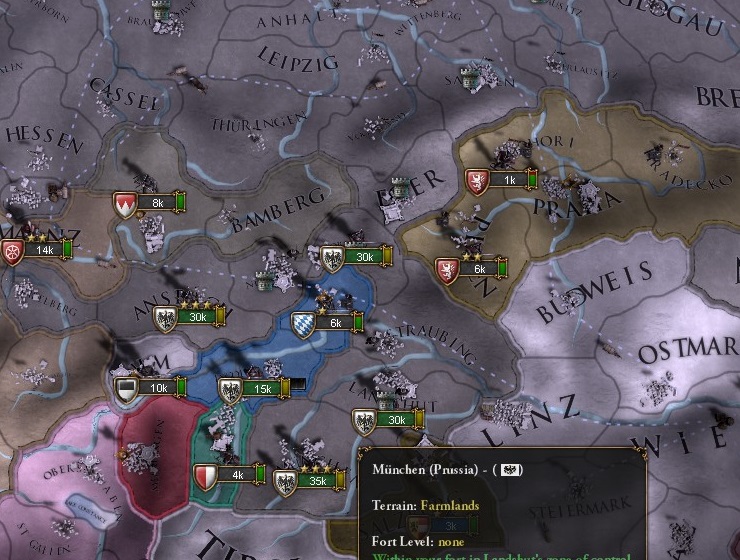 1689年にボヘミアにImperialismCBで迂回宣戦してバイエルンとニュルンベルクを頂く。