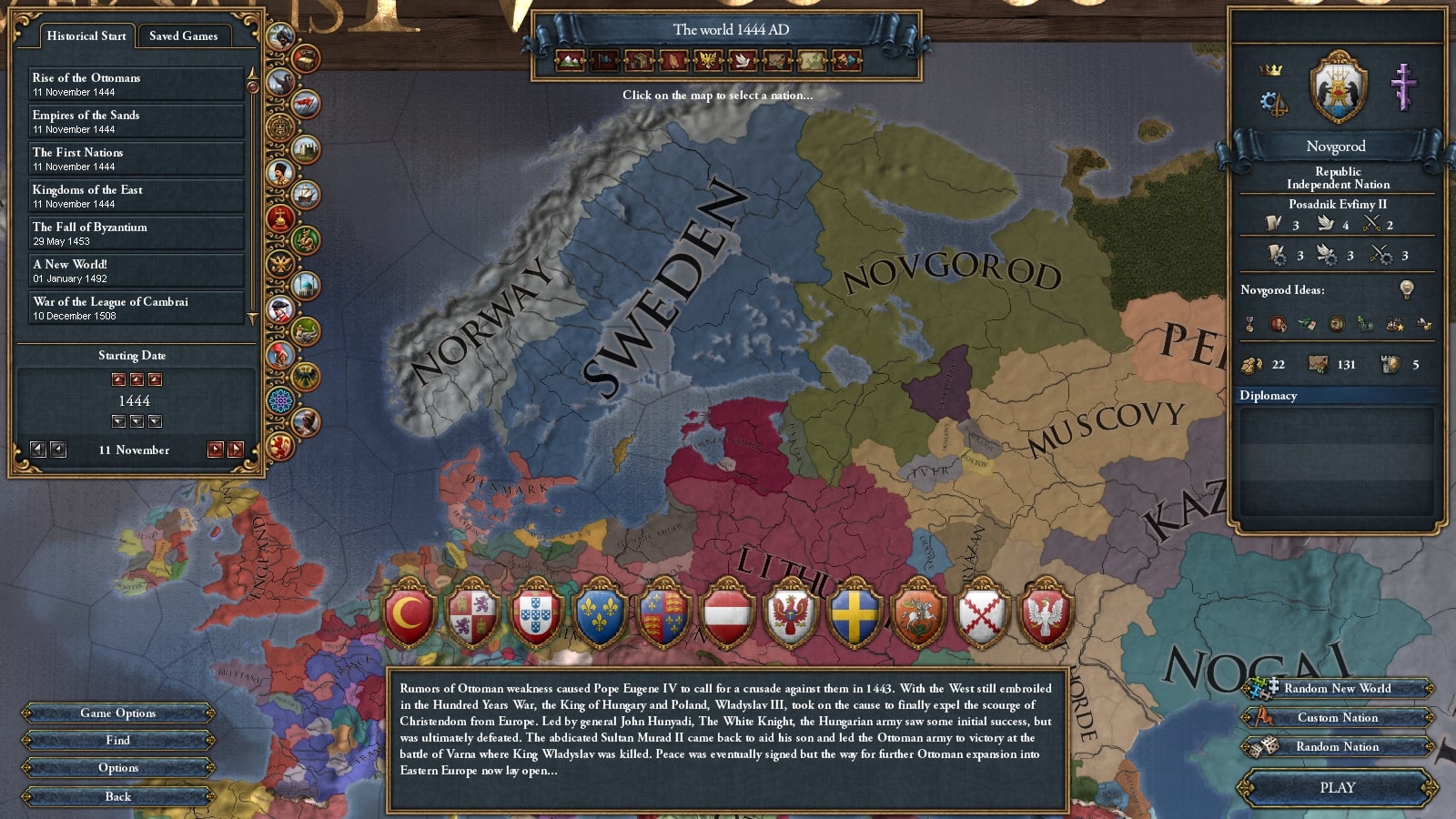 皆さんご存じだと思いますが地図上ではこの位置。カルマル同盟・リヴォニア騎士団/Livonian Order・リトアニア大公国/Lithuania・トヴェリ大公国/Tver・モスクワと隣接しています。初期国力131はポルトガル/Portugalやアユタヤ/Ayutthayaに匹敵し、なかなかの大国です。