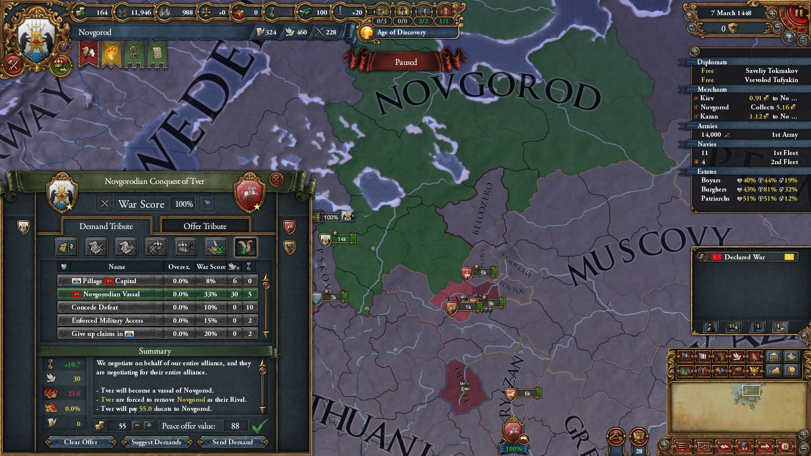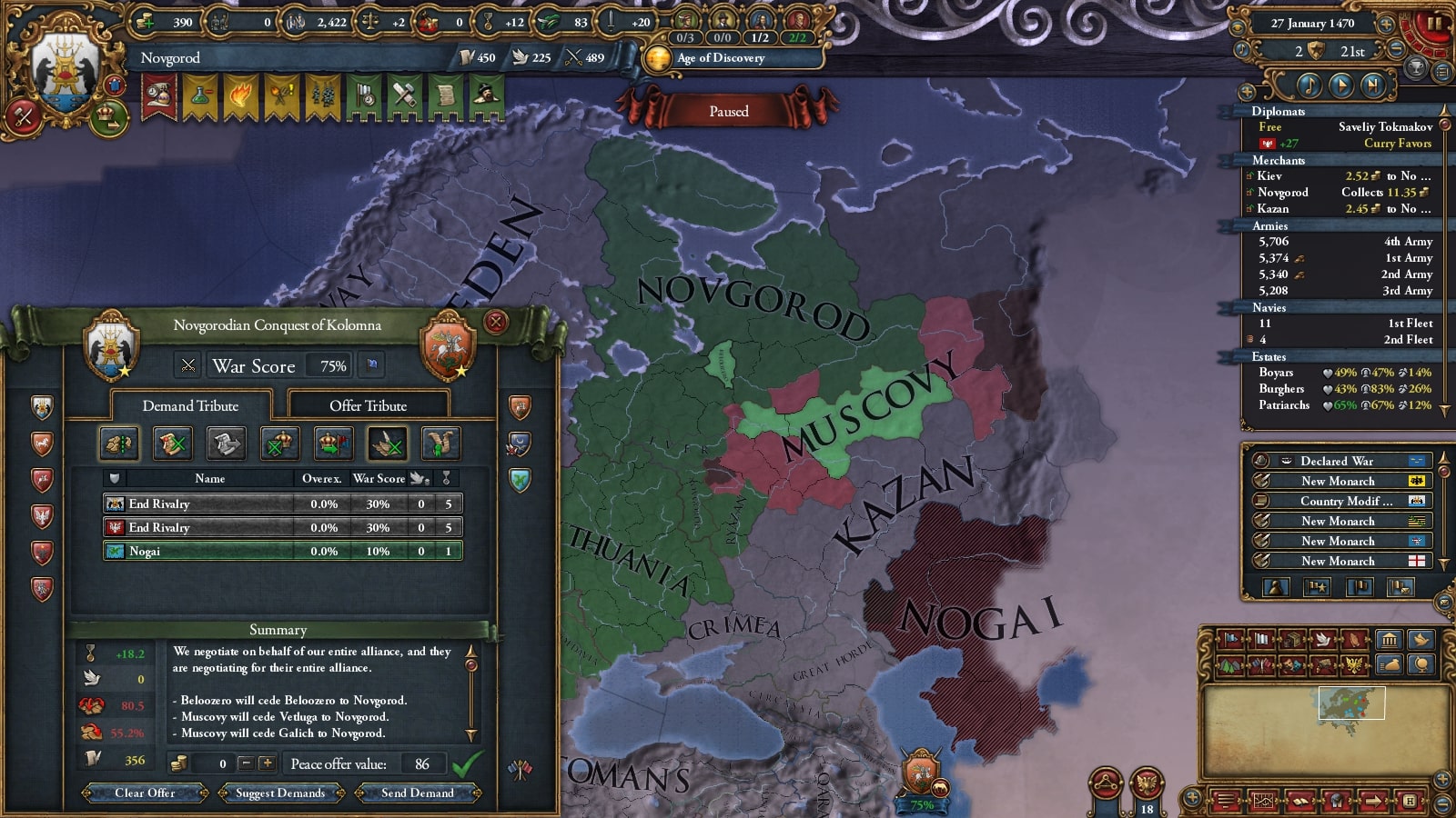 オスマン/Ottomansに相対するビザンツ/Byzantiumほど絶望的ではなく、多少傭兵で軍量を盛るだけで勝てるようになります。ロシア特有のプロビ間の移動時間が長いことも味方し、各個撃破の難易度はかなり低いです。しかしながら要塞州が首都要塞を含めると(おそらく)9つも存在するため、100点講和をするためには8年近く戦う必要が出てくるでしょう。西からカルマル同盟が横やりを入れてくる可能性もありますので、スウェーデンSwedenが独立するように仕込んでおくのがおすすめです。