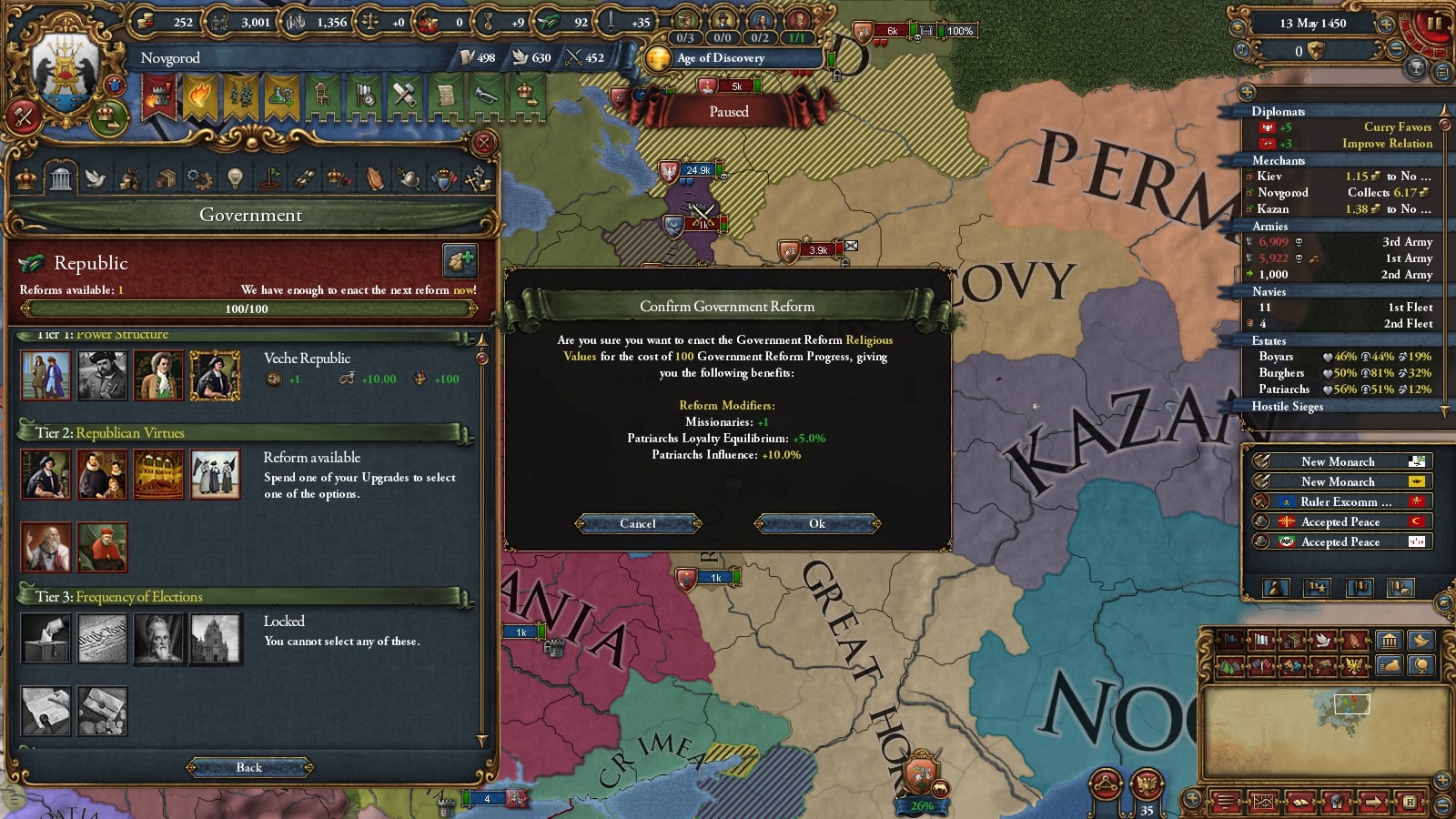 1460年に共和制Tier3を制定しました。このTierは一長一短の政府改革が多く、無難なものがほぼないため制定する政府改革はずっと考えなければいけません。