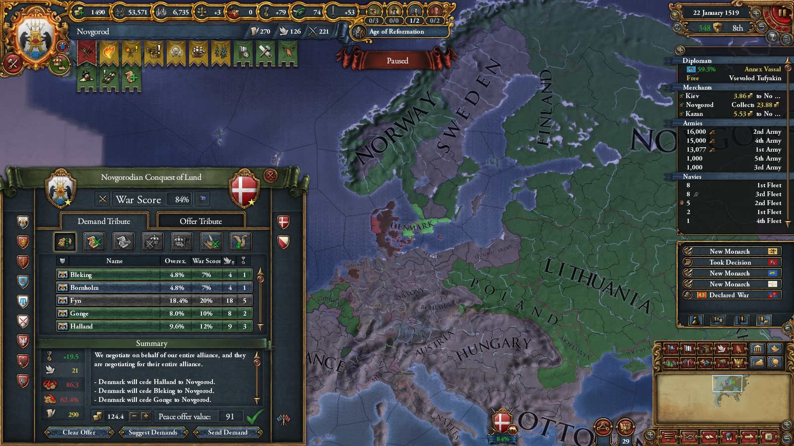 1491年、デンマークとの停戦が切れましたのでデンマークに宣戦します。複雑な戦線となっているためポーランド・リトアニアの動きが心配です。
