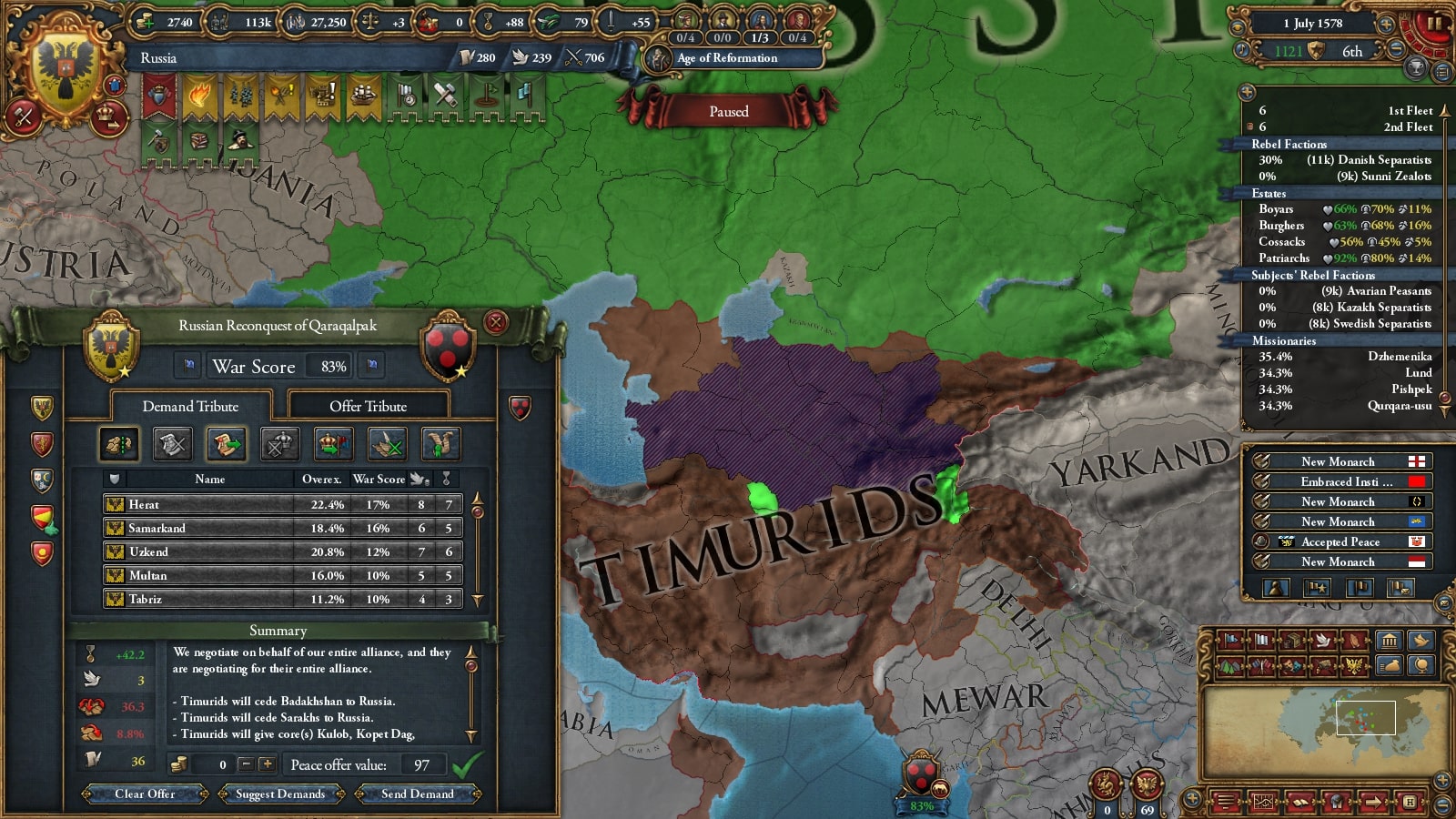 統治キャパシティの余裕がありますので比較的しっかり割譲させます。宗教アイデアを進めている関係で統治点が若干不足しているので、戦後バシキリア/Bashkiriaを解放させました。AE?そんなものは知らない。