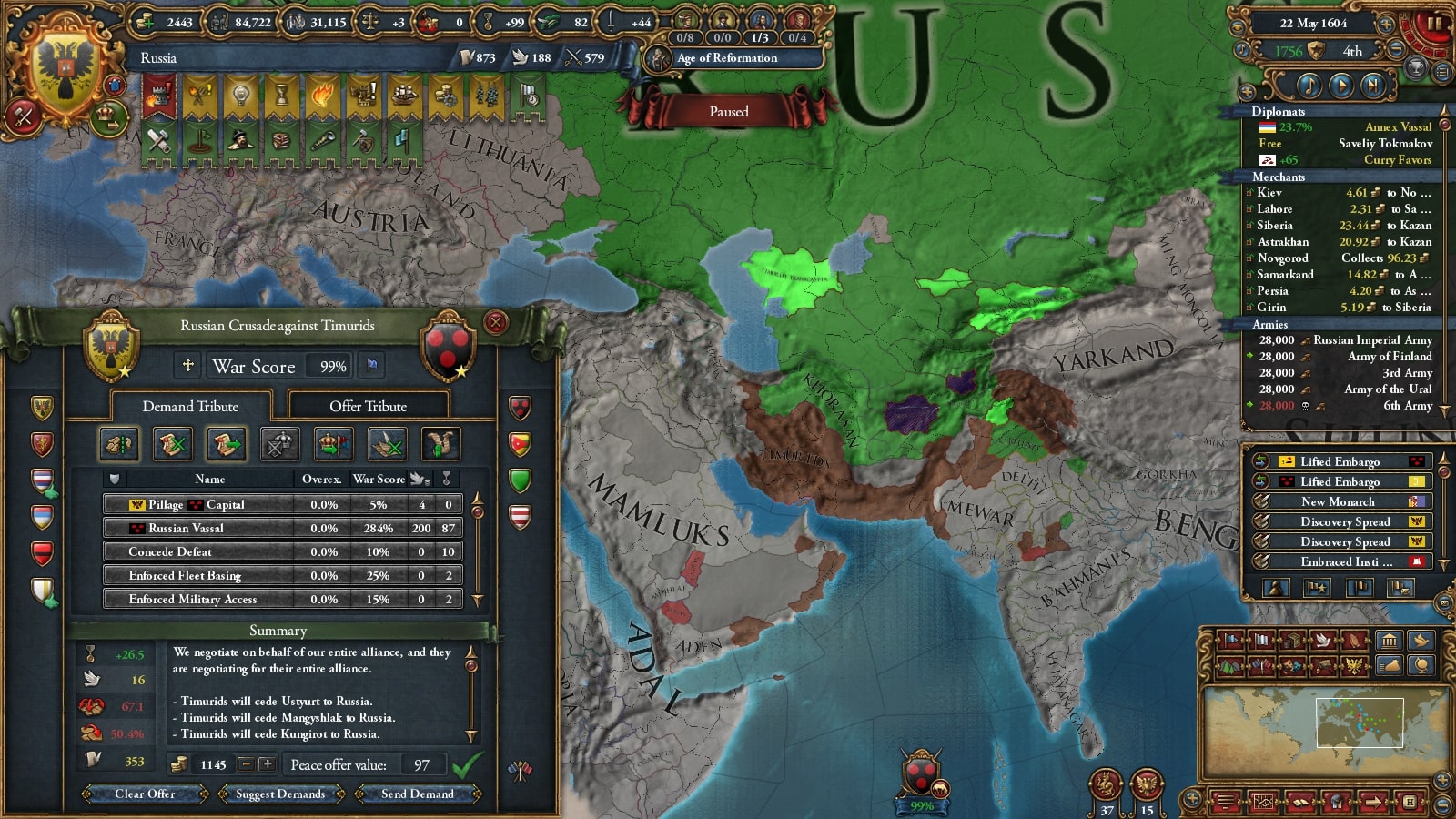 ティムールを、同盟関係を破壊しつつ追い出した後は消化試合でした。途中で宣戦先のシビルがカザフに属国併合され、なぜか戦争中にも関わらず解放される謎事態がありましたが(イベント?仕様?)、無事ティムールの壁を壊せた感じです(ホントに?)。