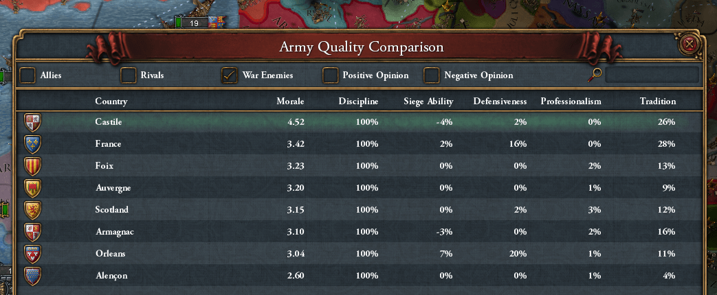 カスティーリャの軍質です。フランスの士気を大幅に上回っております。楽しくなって沢山戦闘したら人的が尽きました。やってしまった…