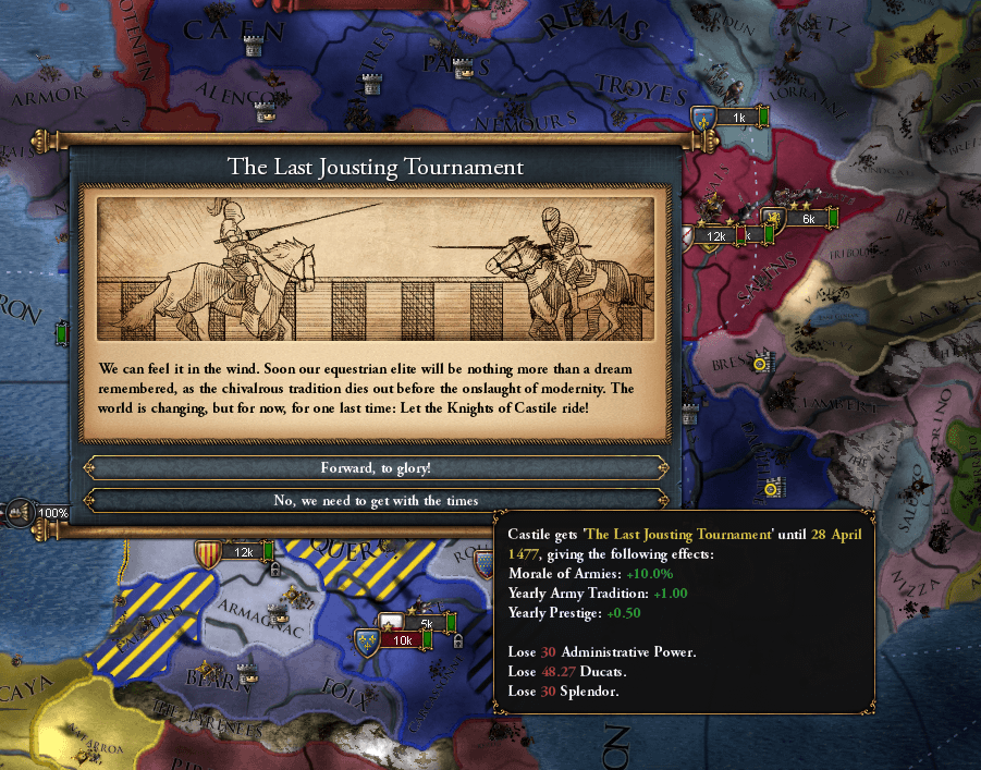また、フランスの直接統治は当分行わないためガスコーニュは辺境伯としています。後に「スペインの左腕」と呼ばれる国誕生の瞬間です。右腕は今後出現します。