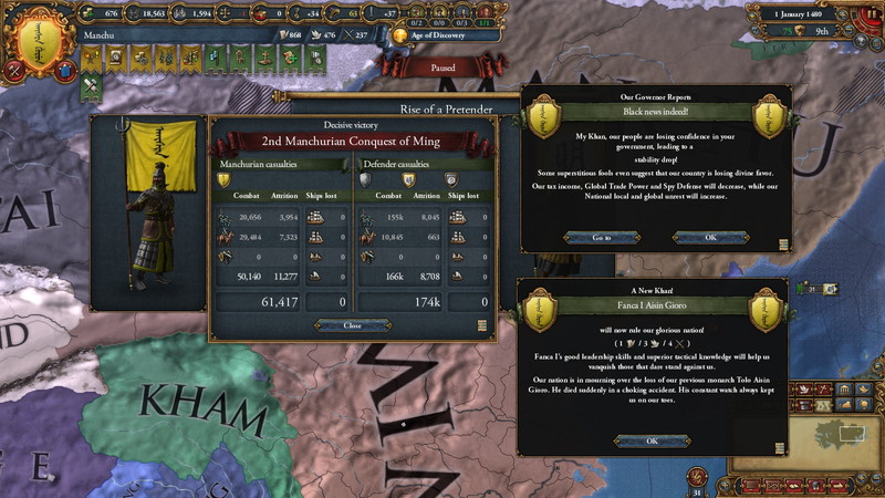だが、満州軍の異常な強さ(discipline115と八旗)を前に、各地で徹底的に敗北し、将は討ち死に、一時は兵力の過半が消滅。