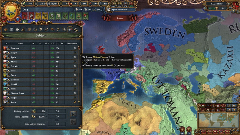 あまりに大きな国を朝貢国にしますと独立欲求が+500などあり、さっさと離脱されてしまいます。