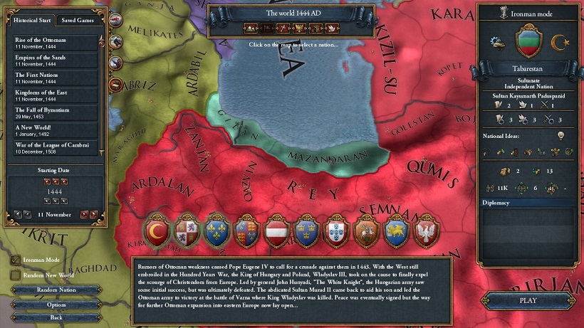 これは必須というほどではないが、我が国の初期常備軍は歩兵3、騎兵1となっている。当面はまともな戦闘はしないのでこの騎兵は解散させておこう。さらにDIP以外のアドバイザーは適当に+1のを雇っておこう。Tabaristanに要塞を築くミッションが選択できるが、同盟締結までは国庫は貯めておくように。