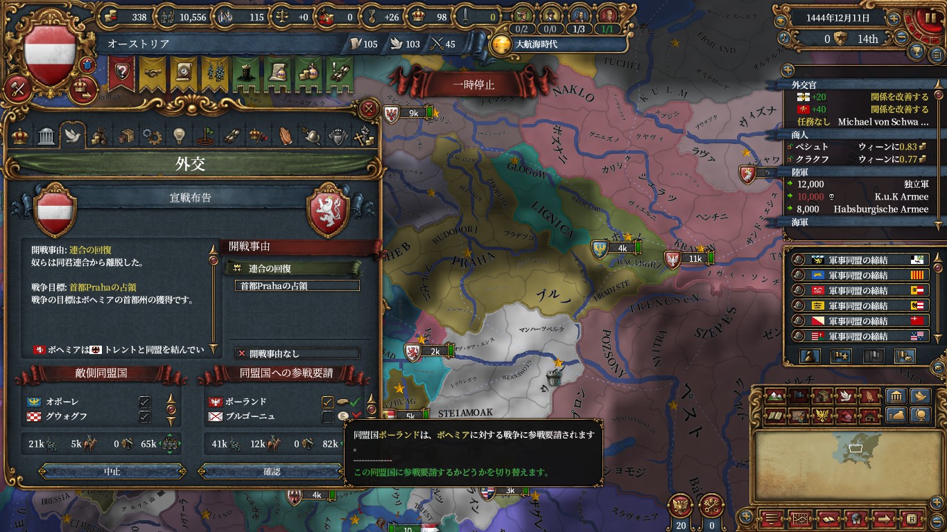 独立傭兵団を雇い、同盟のポーランドに土地を確約(実際にはあげない)して、ボヘミアに同君CBで宣戦