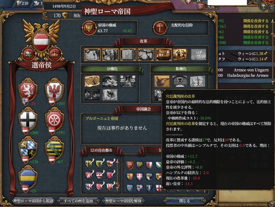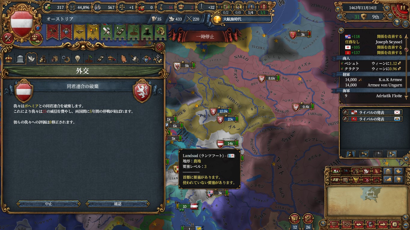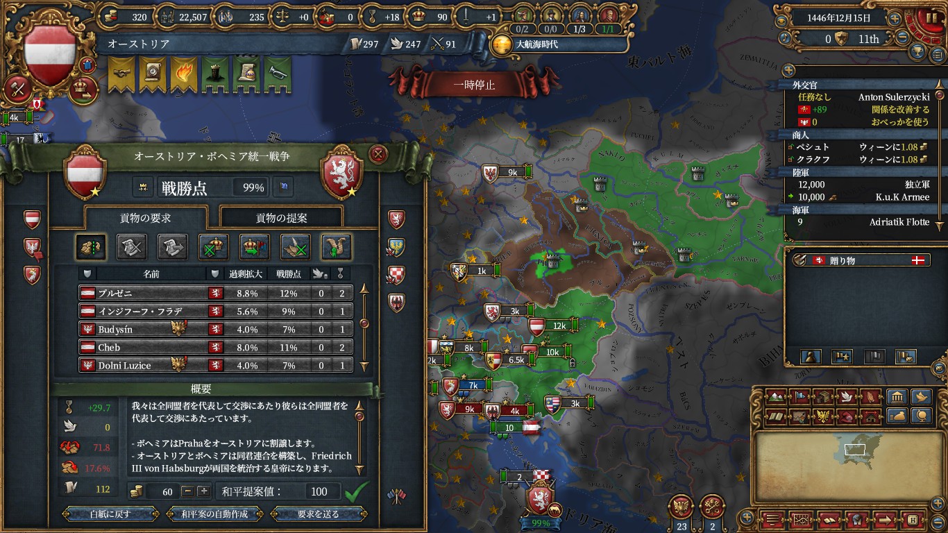 破産する前、君主点を消費するため自領を開発しましたが、ボヘミアを制御するためにボヘミアを開発すべきでした。