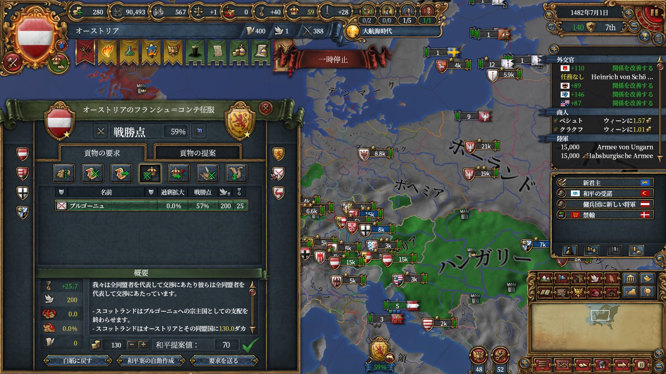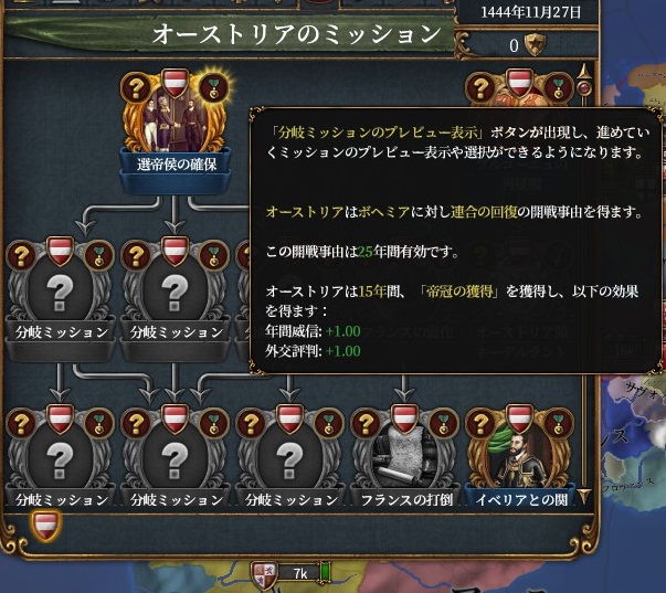 選帝侯4つから評価75以上にしたのでミッション「選帝侯の確保」を達成し、ボヘミア同君CBを獲得