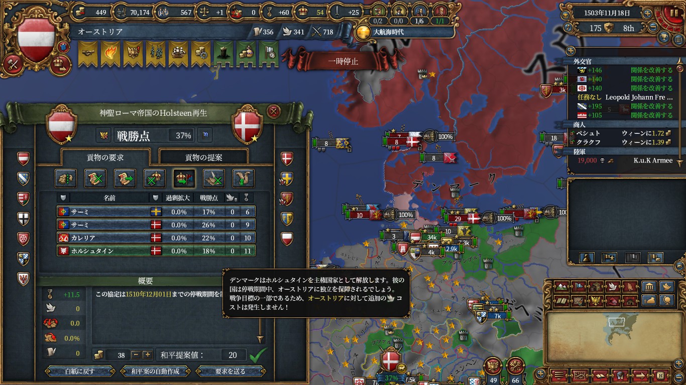 なお、このあとプロシア連合によりチュートンvsダンツィヒ・ポーランドの戦争が起こりますが、チュートンが攻撃側なのでチュートンに和平の強制をすることで白紙和平を狙えます。