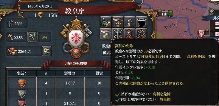 これなら簡単に評価150以上にでき、すべてのイタリア諸侯の統制ができている場合、ディシジョン「イタリアの統制」を実行できIA+25できます。