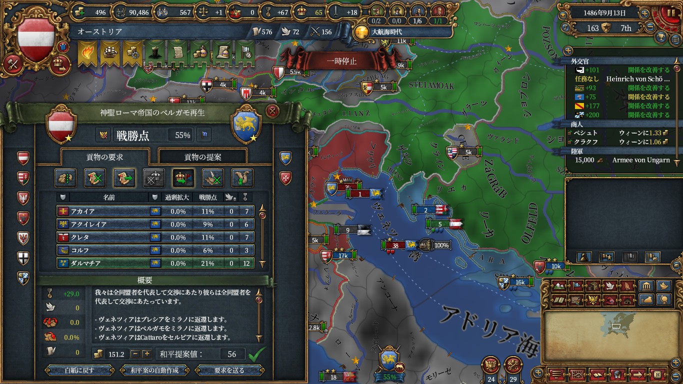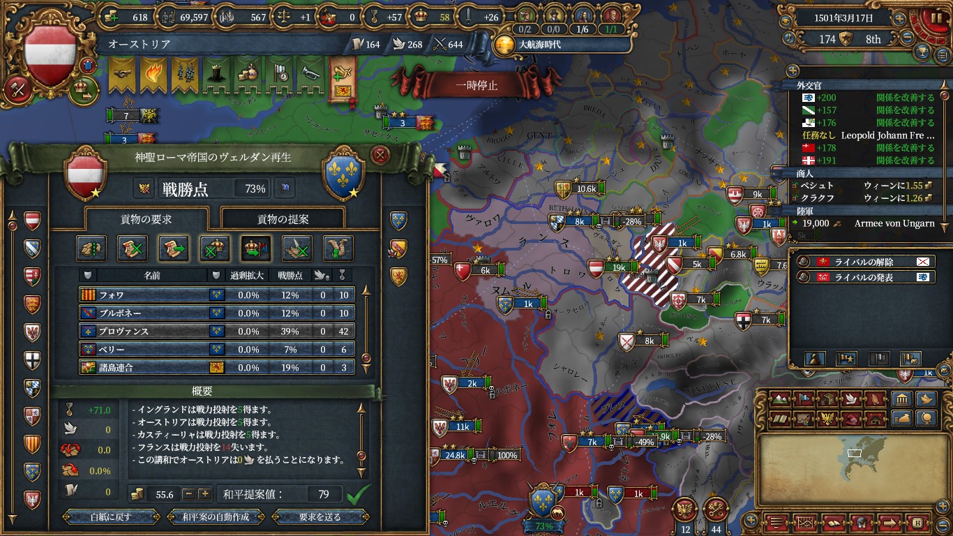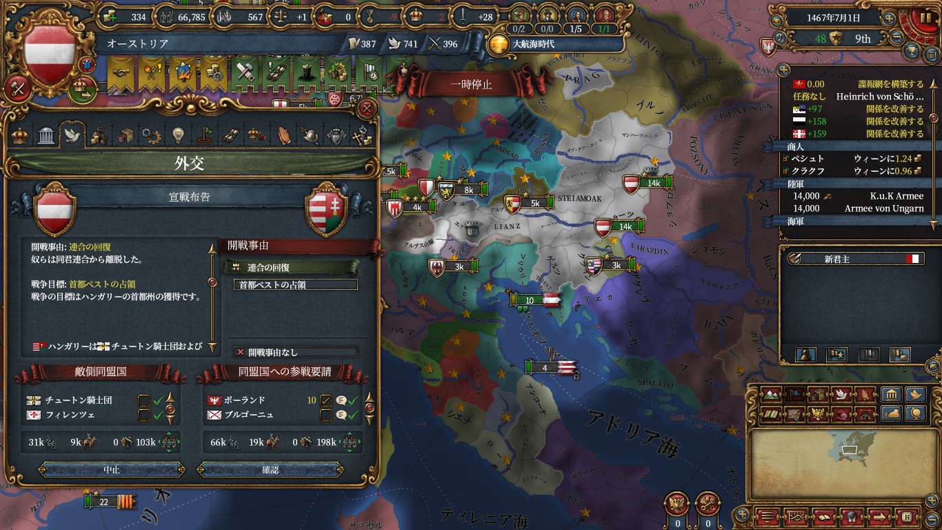 1.HREが平和状態(IA+0.1の補正がある)のときはなるべくHRE諸侯(敵同盟含み、ボヘミア除く)と戦争しない