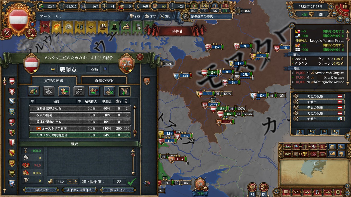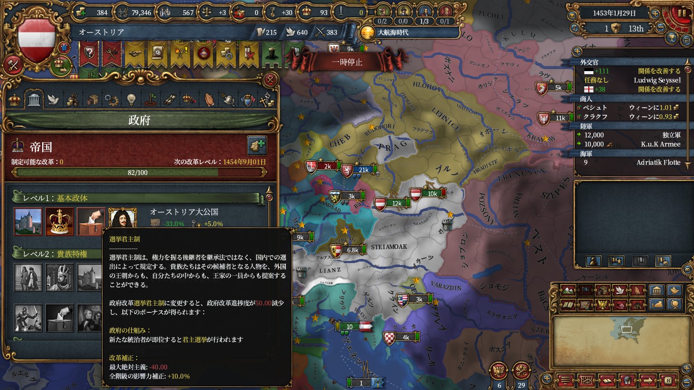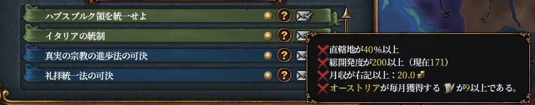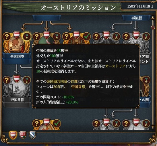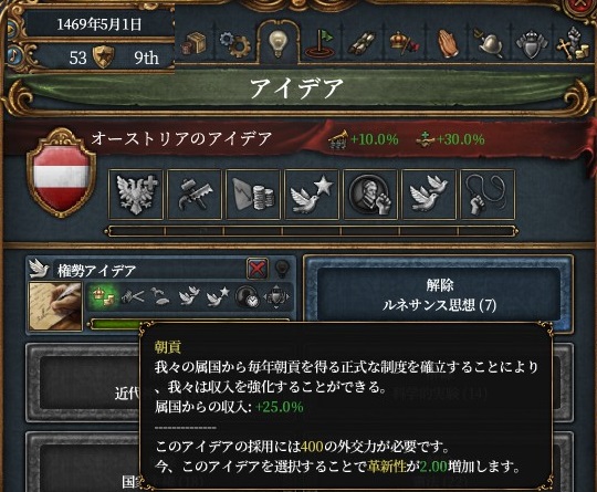 オーストリア限定のイベントで安定度-1と引き換えに恒久の外交評判+1とアイデアコスト-5%獲得