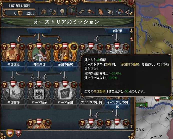 10州以上の帝国諸侯を支配または評価100以上で達成できるミッション「帝国の権勢」を達成