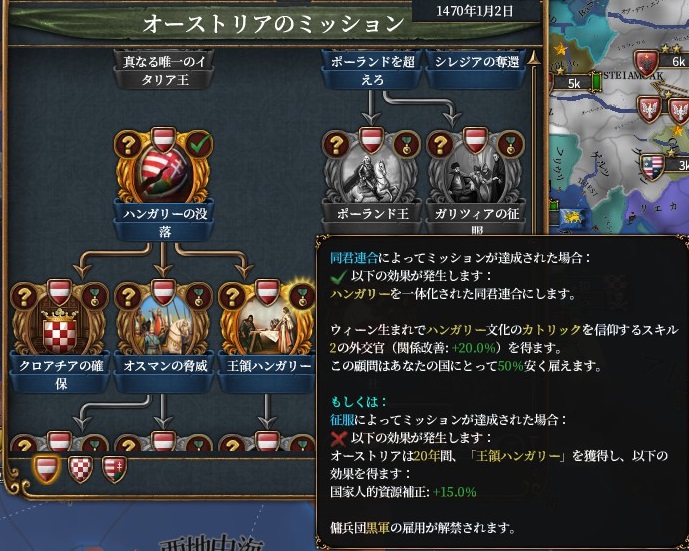 ボヘミアを同君にしたので、ミッションを達成し帝国権威4と外交評判独立欲求減を獲得