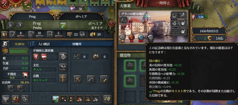 開始時点ではプラハはフス派なのでモニュメントを利用するのにカトリックに改宗しなければならないので、確保したあとはフス派の聖地補正の布教強度-5%を相殺するため布教強度を盛りカトリックに改宗させたあと、最大まで借金をし、「プラハの歴史地区」モニュメントに投資していきます。
