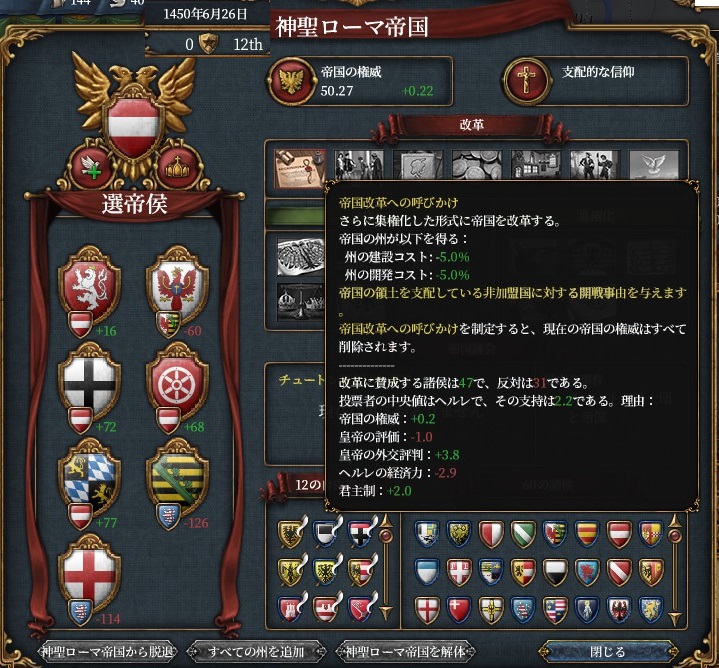 すべての君主制国家が使用することができる政府改革tier1の選挙君主制では通常の継承方法に加えて、支配者が死亡時、選挙イベントが発生し、現存する後継者を支配者にするか、別の者を支配者にするか選ぶことができます。