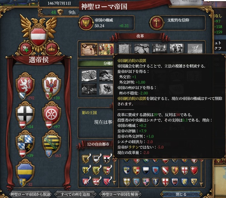 上の画像では何人か候補者があり、能力の高い候補者を選べるため、最大絶対主義-40と全階級影響+10%という重いデメリットはありますが、絶対主義を気にしない時代ではかなり優秀な改革となってます。