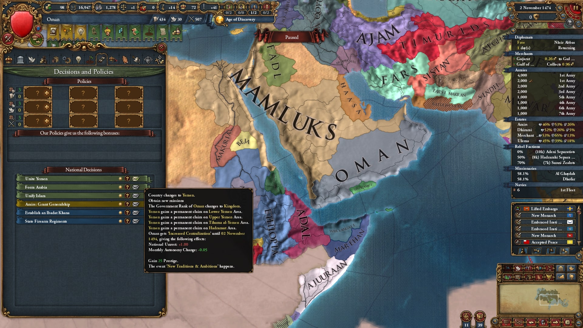宗主国マムルークはそのCBを使ってシャンマル→ナジド→ダワーシル→イエメンとものすごいスピードで征服します。オマーンにはマムルークを相手にする国力は流石にないため、最低限の国力を得るためにはマムルークが征服するよりも早くアラビア半島で拡大をする必要があります。