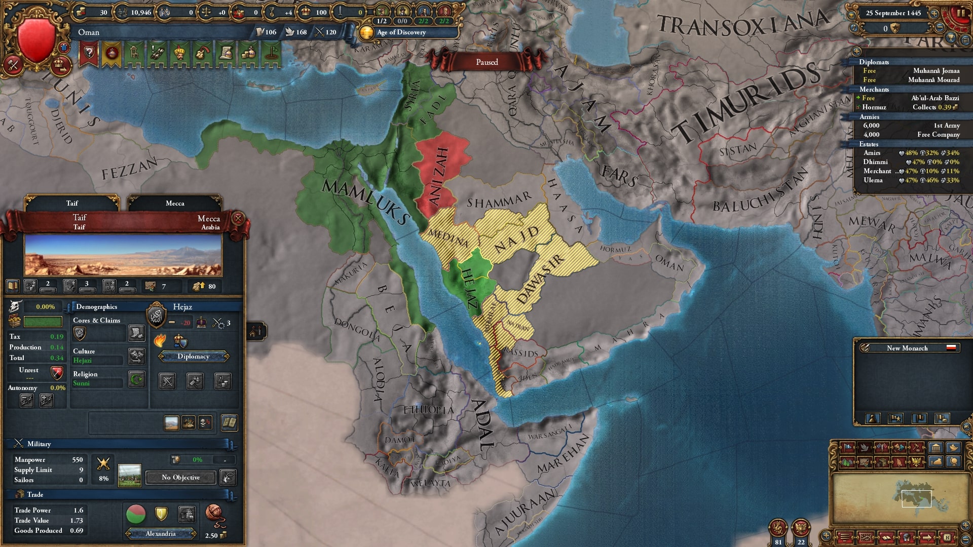 1.35以前の大人しいマムルークと比べて、1.36マムルークはアラビア半島での拡大を素早く行う傾向があります。原因はマムルークの新ミッション...ではなく属国ヒジャーズの新ミッションです。