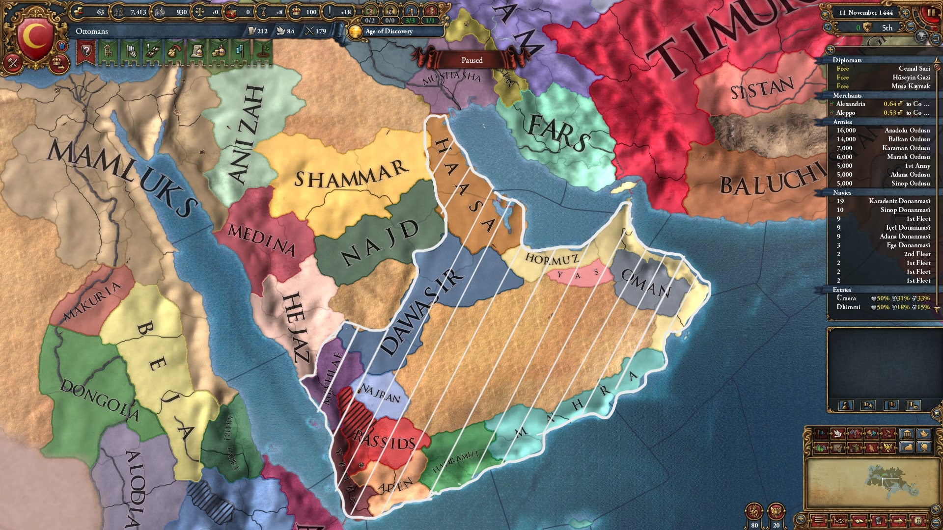 ナジドと同盟しつつ12/11からホルムズ&ダワーシル戦、ダワーシルは蹴り出してホルムズからは旧領+α、そのままマフラ&アデン→ラシード→イエメンとアラビア半島南部を通ってイエメンへと流れ込みます。属国アデンを併合し1474年にイエメン形成。