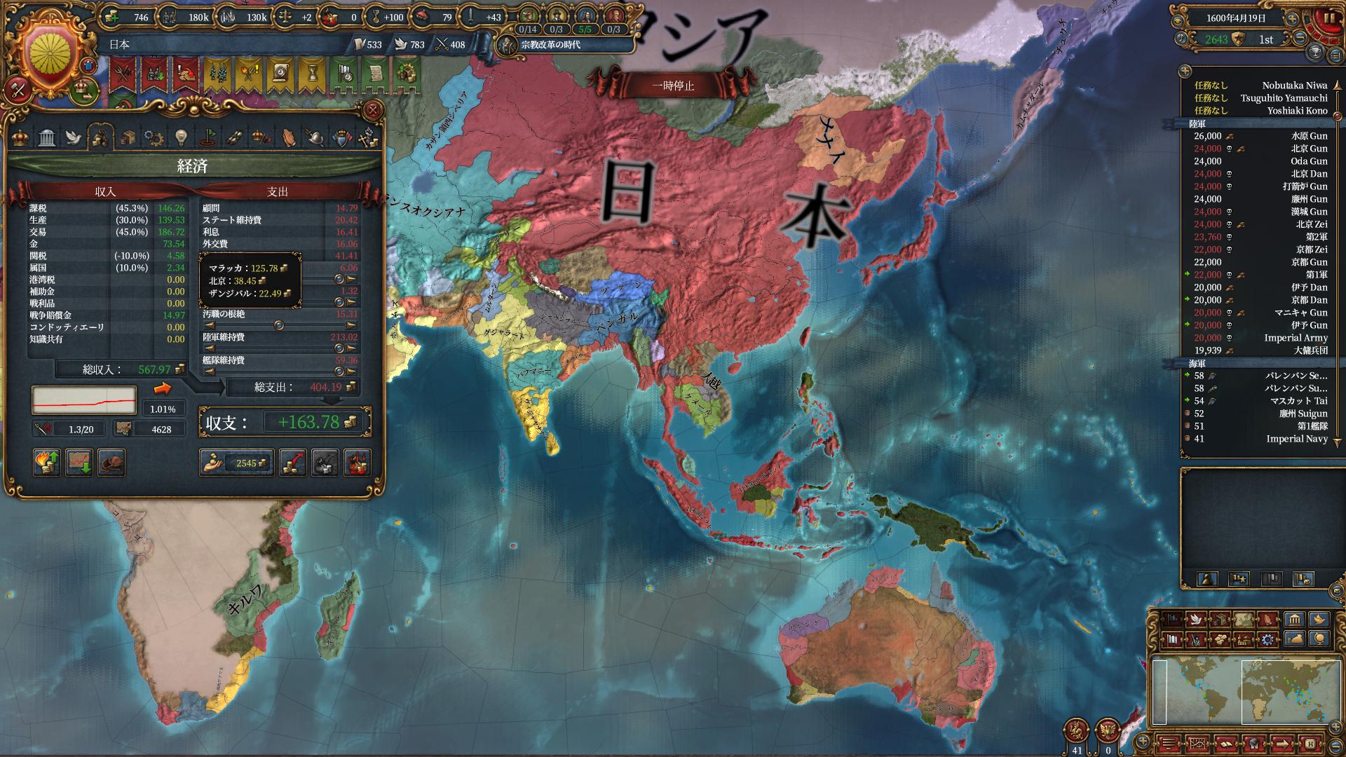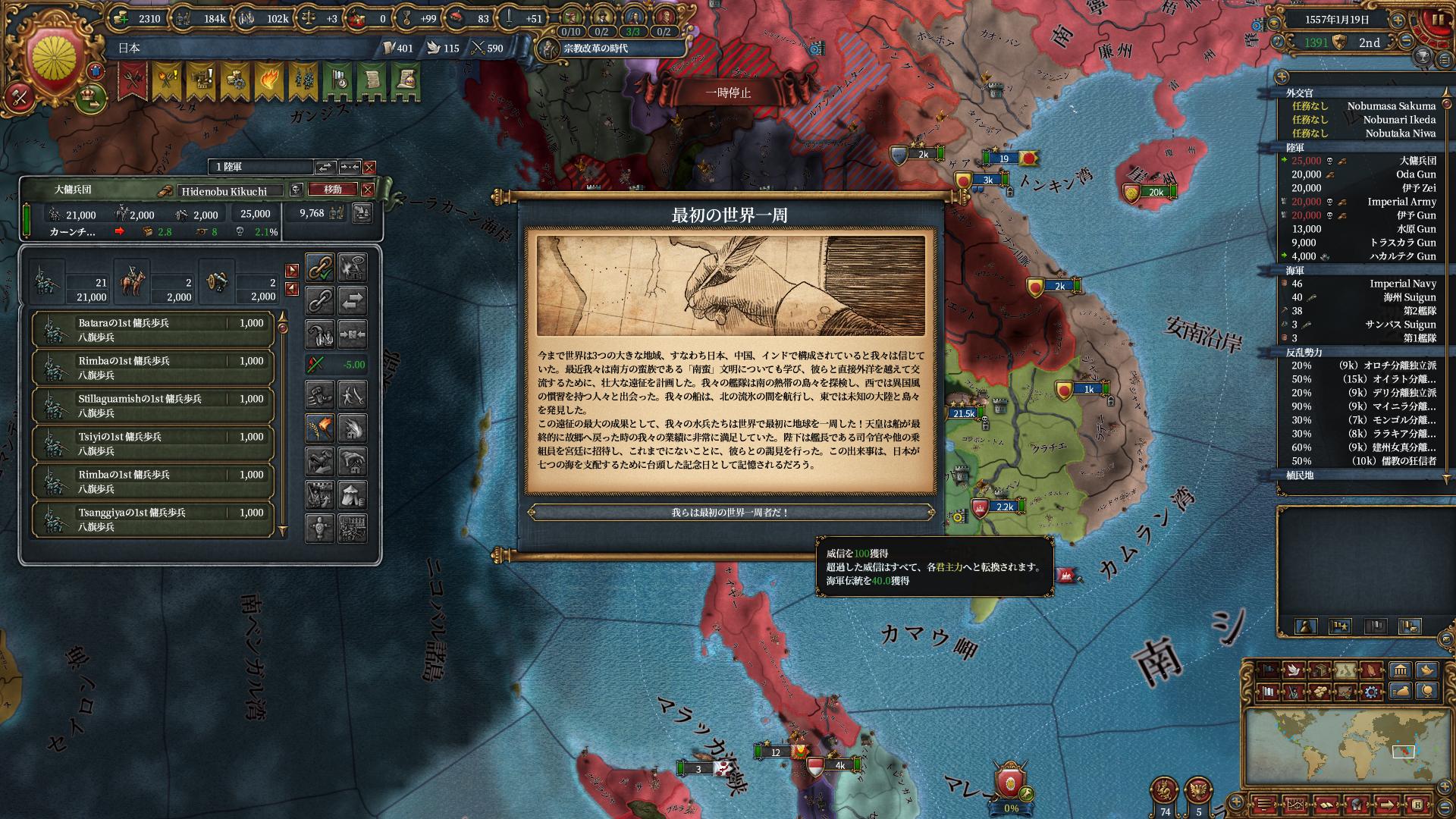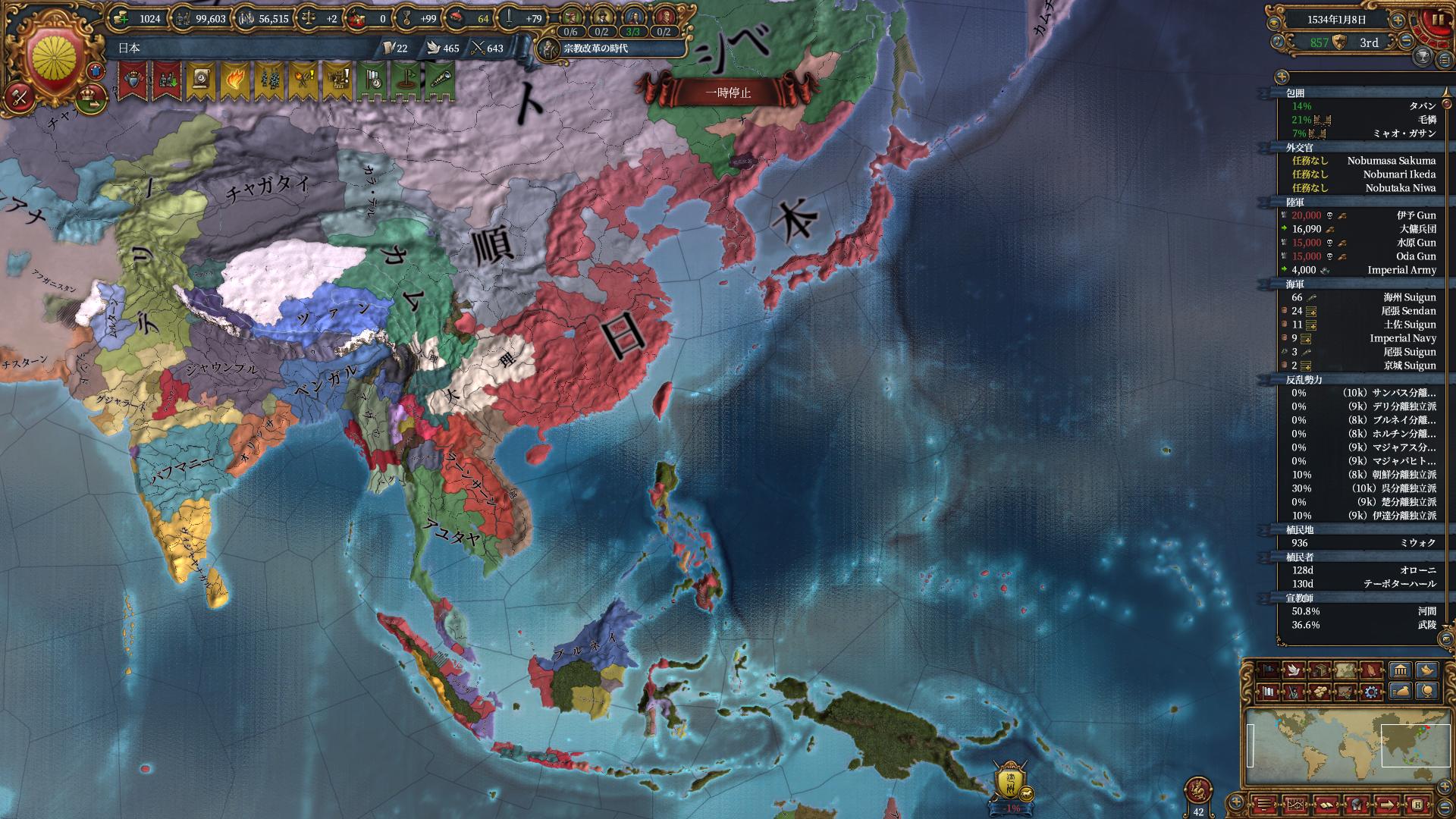 その後陸軍を増やし美濃か伊勢には必ず進出・AEが増えすぎない程度に拡大・大名の淘汰が進んだら(10以下?)同盟を結べるだけ結んで足利に宣戦、同盟国が京都を占領すると幕府になれないため京都は真っ先に抑える。