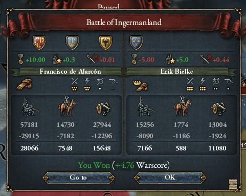 既に人的資源も尽きた状態だったスウェーデンは首都ストックホルムを始め主要都市が陥落しましたが、帝国軍が要求したのはカトリック国として復興されていたスコットランドへの領土返還が主でした。