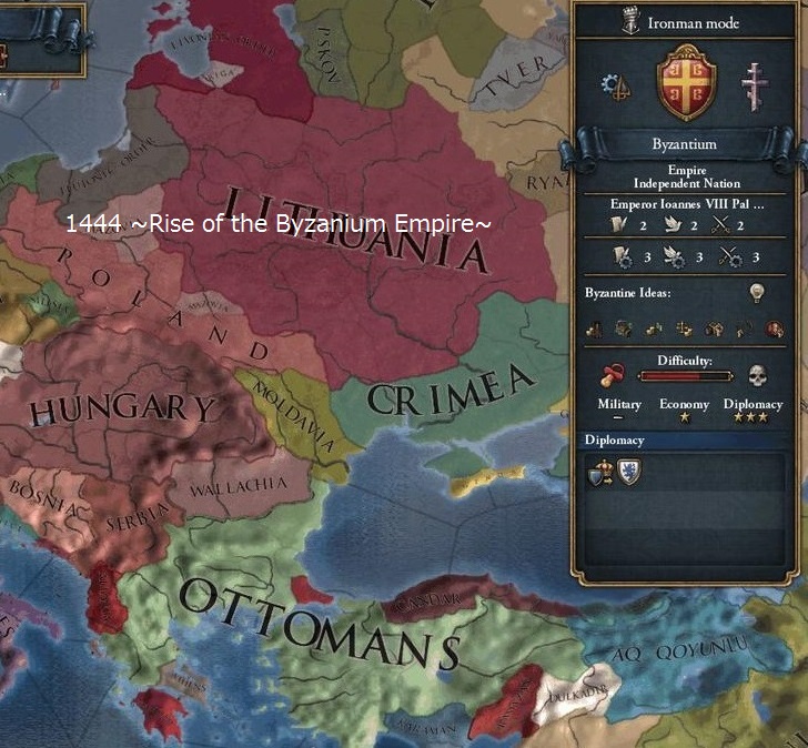 EU4で初心者向け国家として有名なビザンチン帝国でのプレイです。
