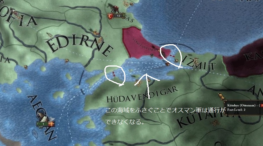 (2)オスマンの海軍に勝てるだけのガレー船ができたら、オスマン軍がコンスタンチノープルの右側に行くのをまって宣戦布告。