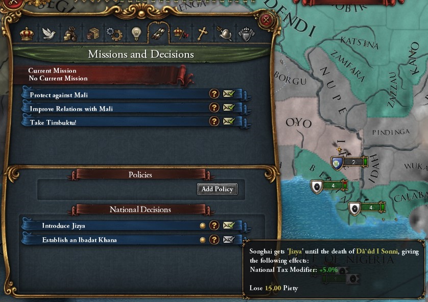 *4 注4:≪Introduce Jizya≫イスラム教国特有の政策。州数が16以上になると選択肢が現れる?。「統治者の統治スキルが3以上」「摂政評議会でない」場合に選択できる。統治者が存命中に限り「税収+5%」の効果を得る他、Pietyが15減少する。