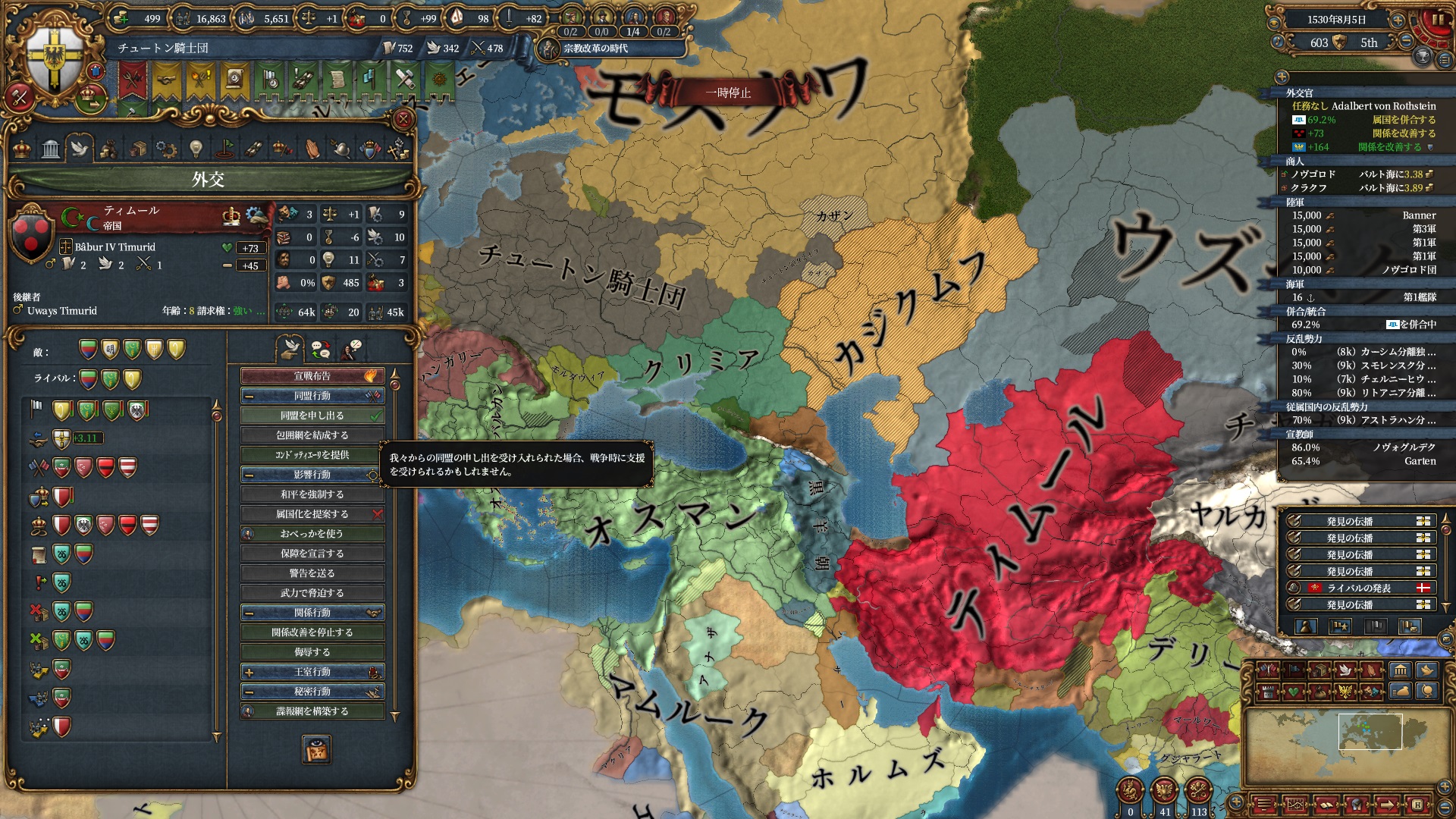 モスクワはもうノヴゴロド再征服で落とせるので、ティムールと組んでいるカジクムフを殴る所を上手くクリア出来ればHoly Horde制定は割と近め。