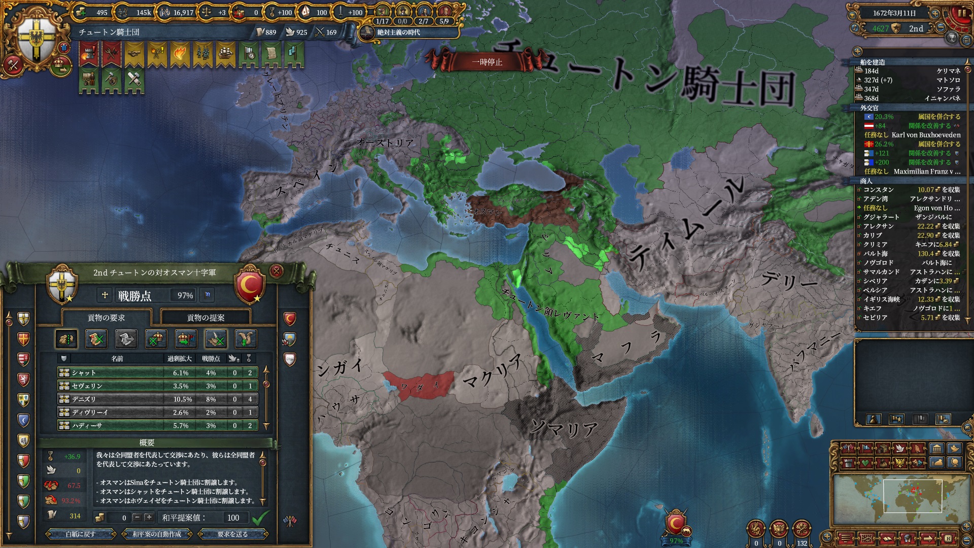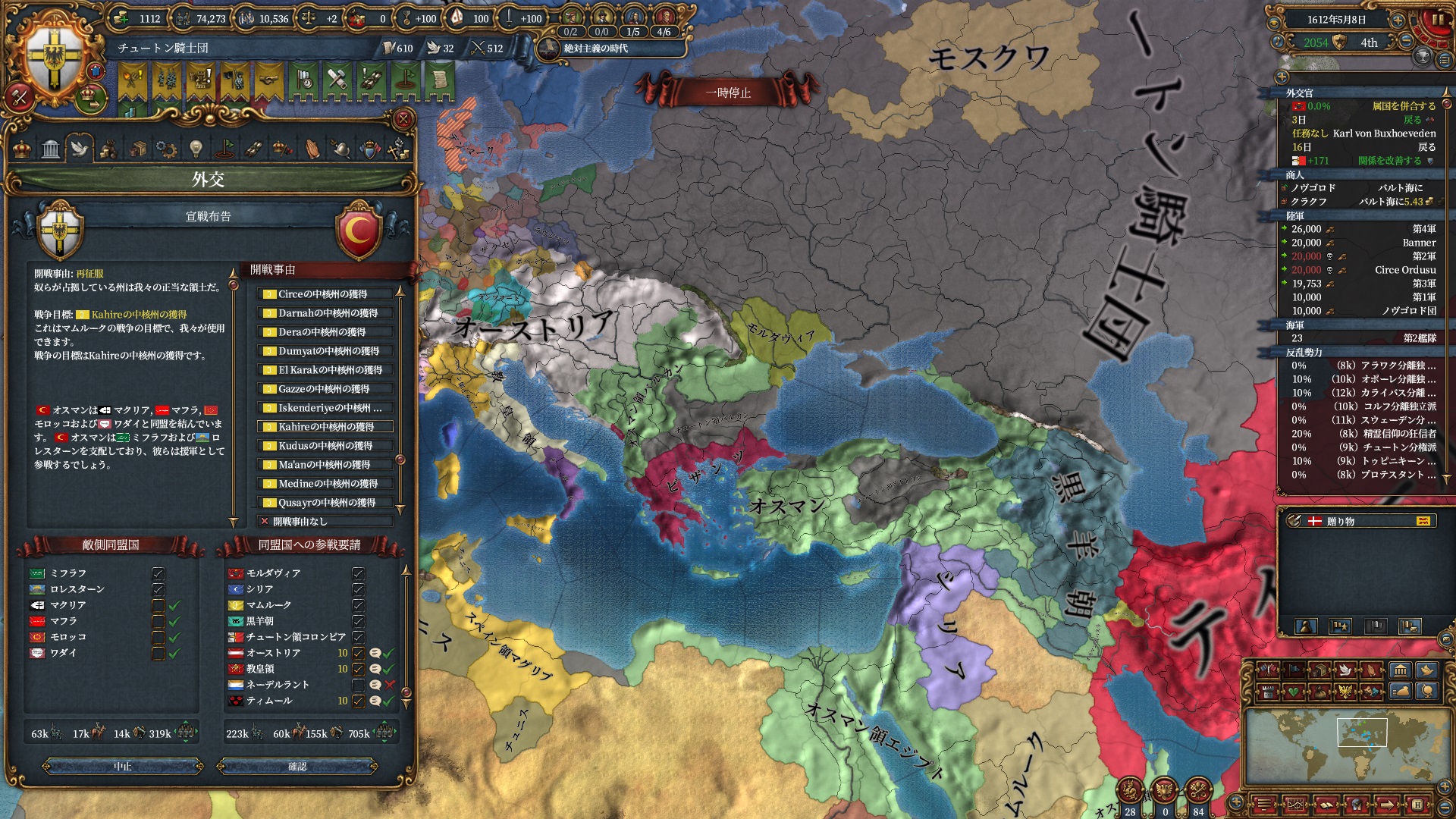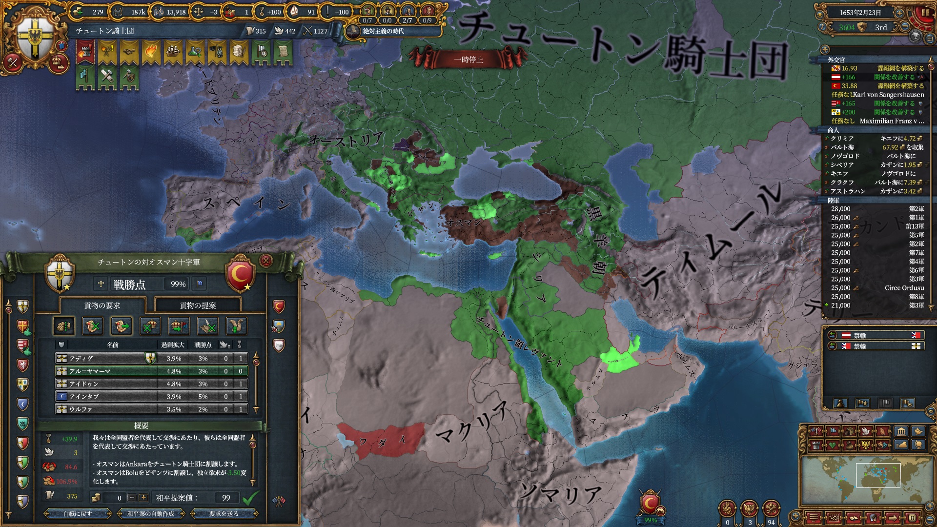 マムルーク併合さえ済ませばそろそろ取れるHoly Hordeで思う存分南下出来るので待ち遠しいですね。