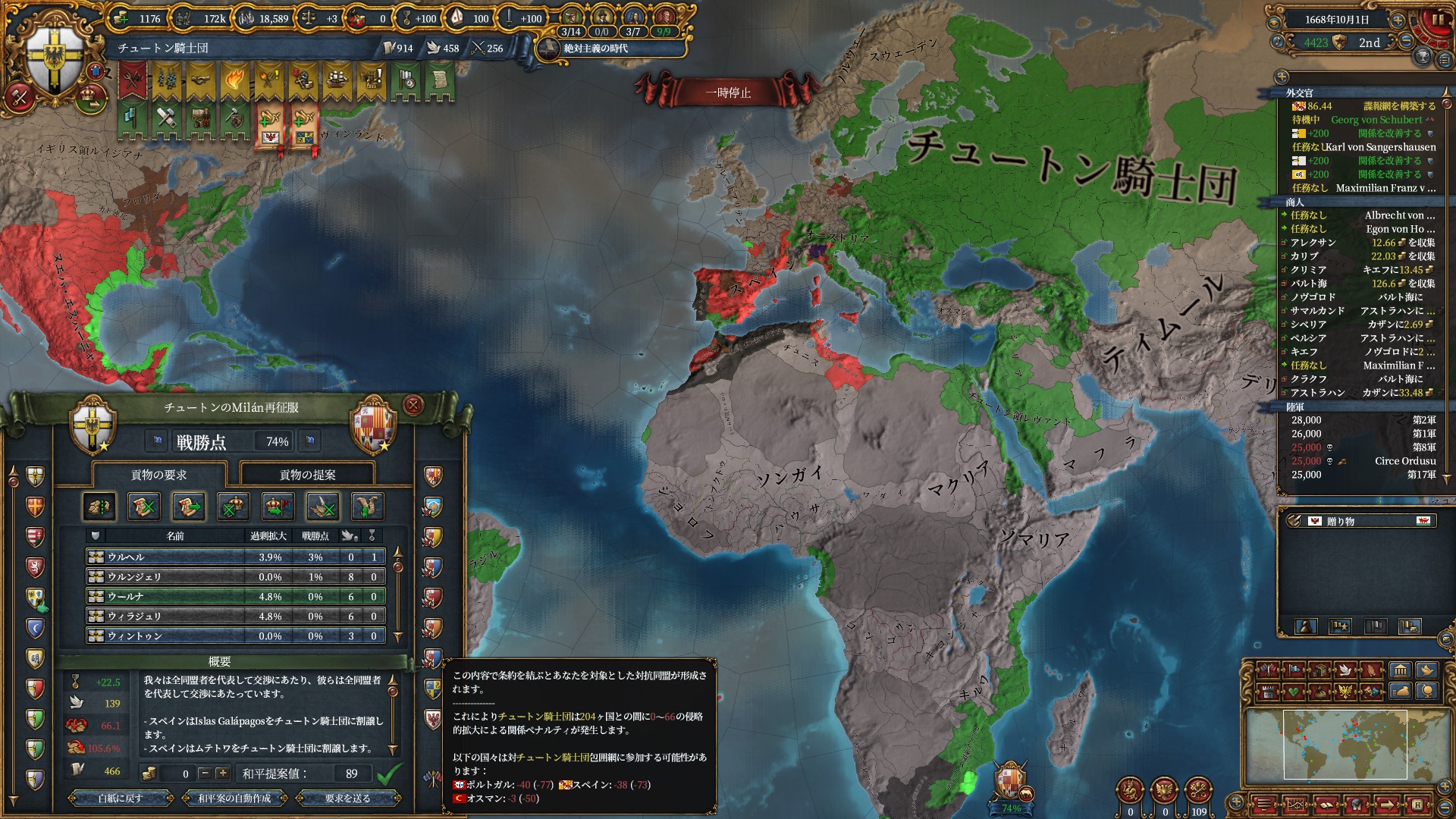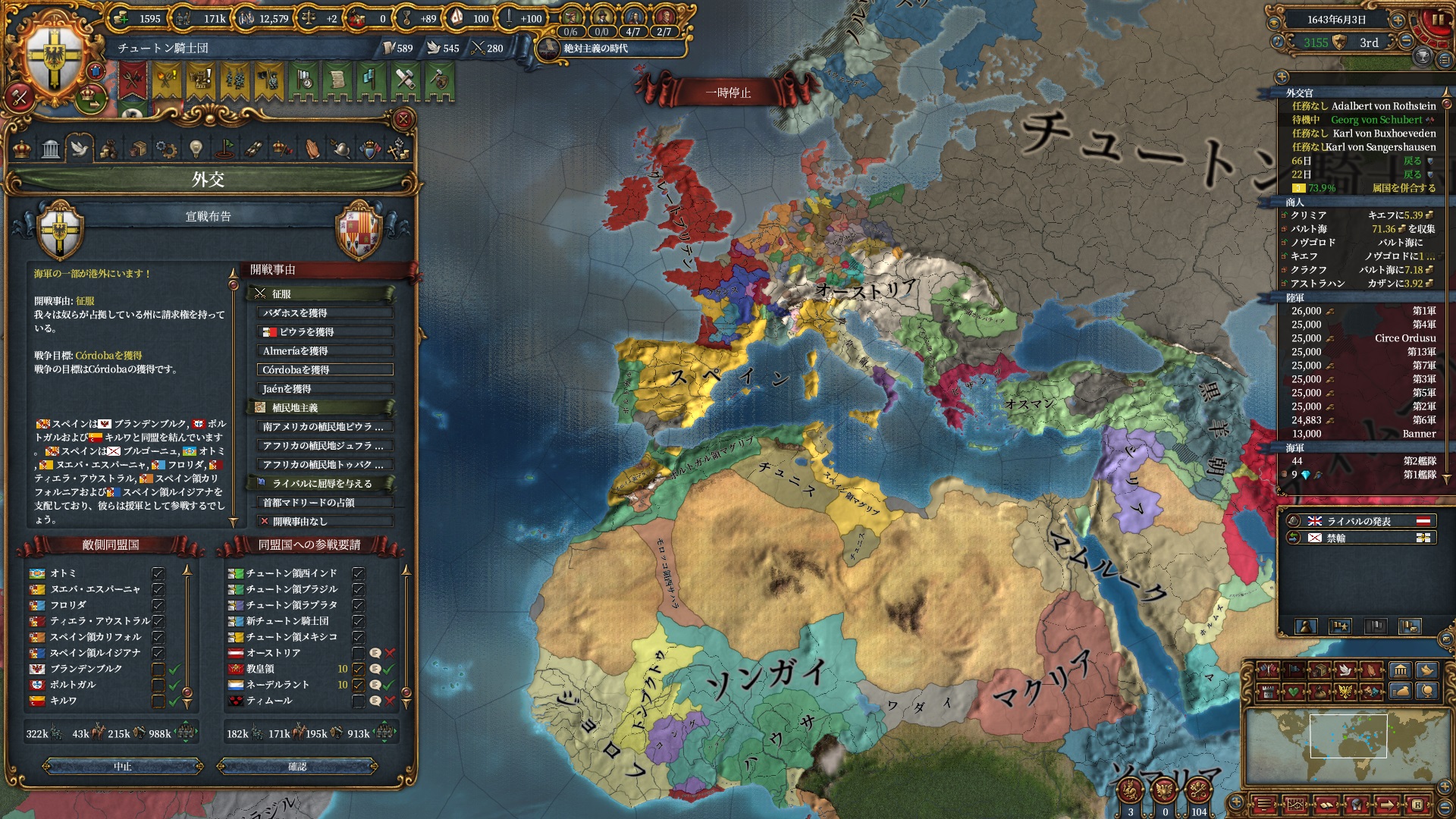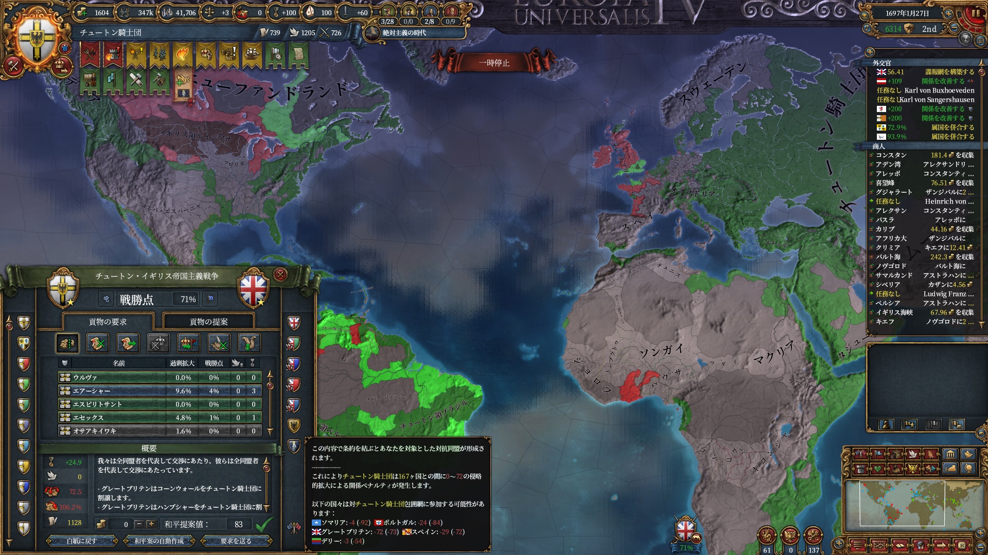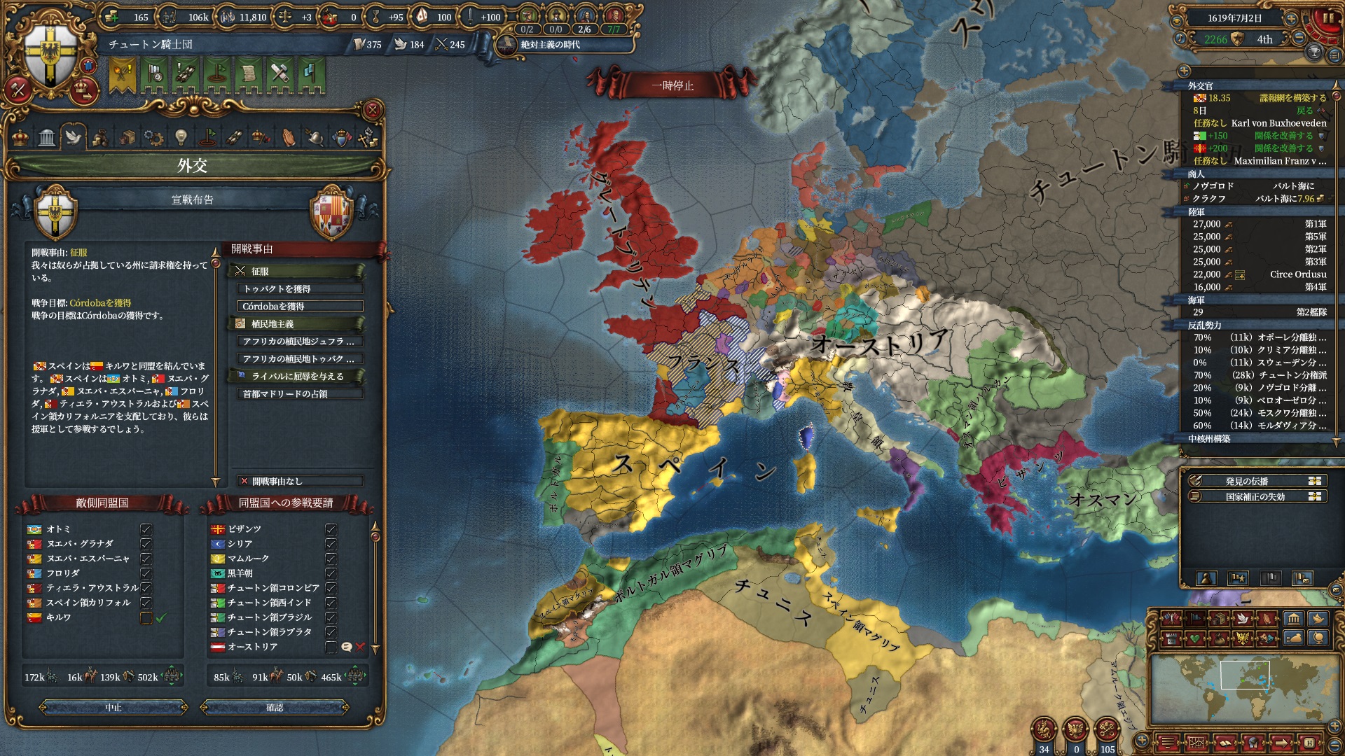 あとはOpinionが許す限り同盟を引っ張っていきますが、欧州のラスボス候補はもうおらず欧州外は宗教が異なるため一瞬で刈り取れ、少なくとも世界征服は当確といっていいでしょう。
