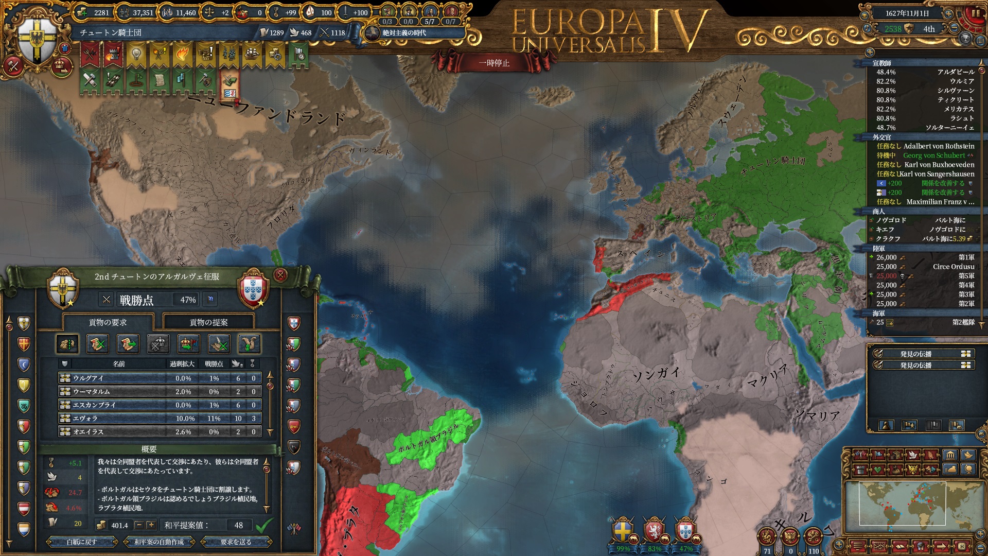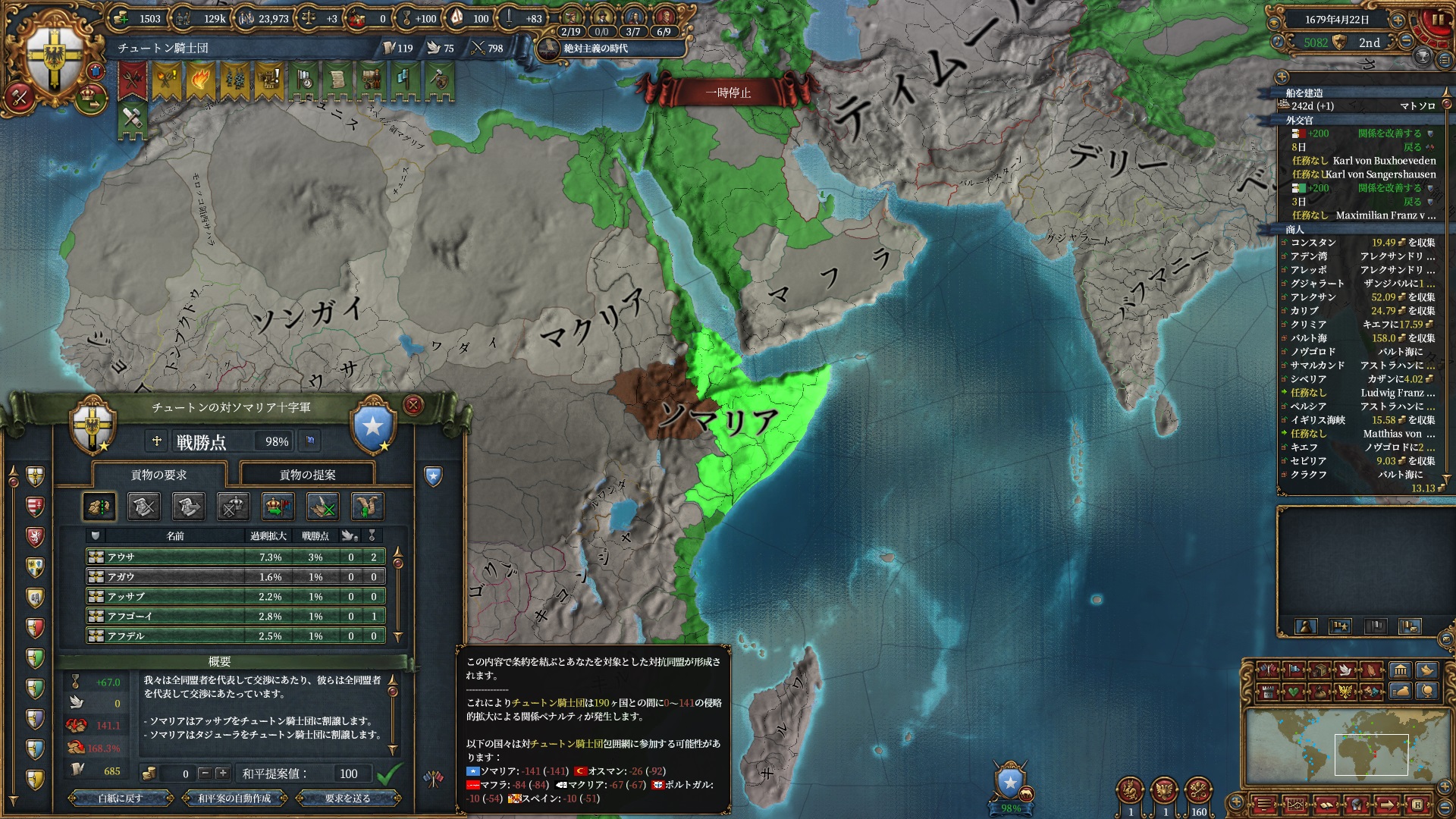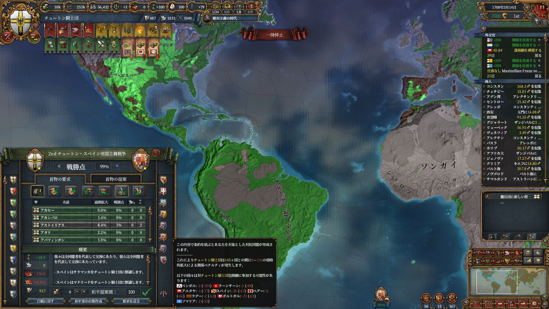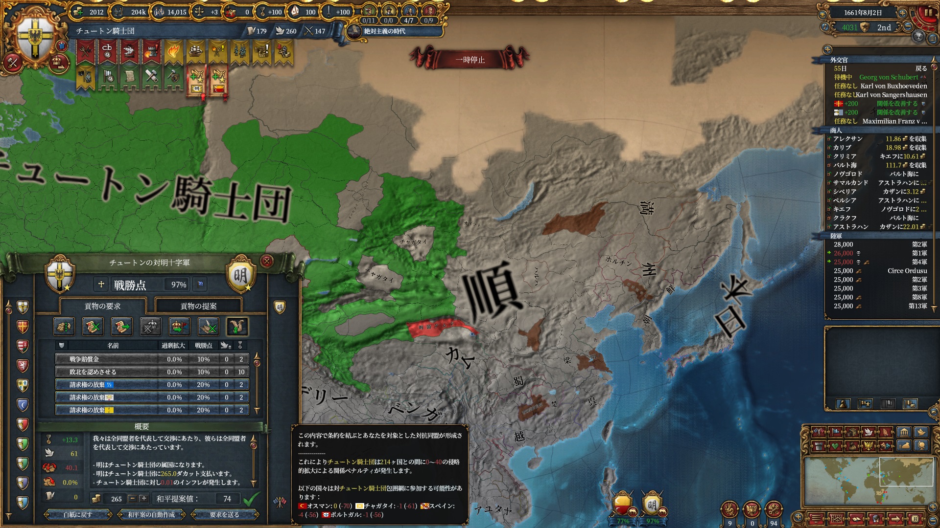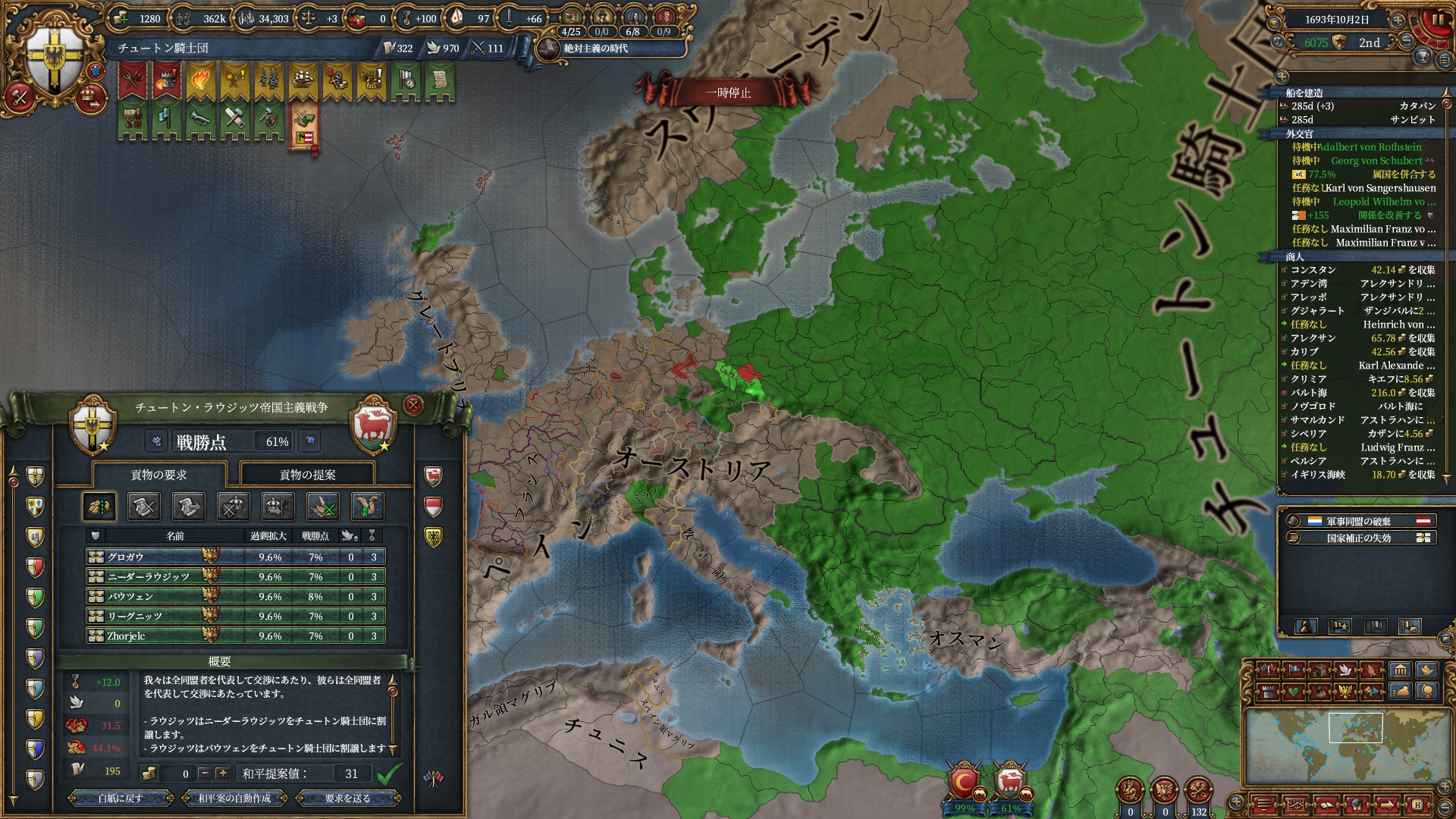 あとはOpinionが許す限り同盟を引っ張っていきますが、欧州のラスボス候補はもうおらず欧州外は宗教が異なるため一瞬で刈り取れ、少なくとも世界征服は当確といっていいでしょう。