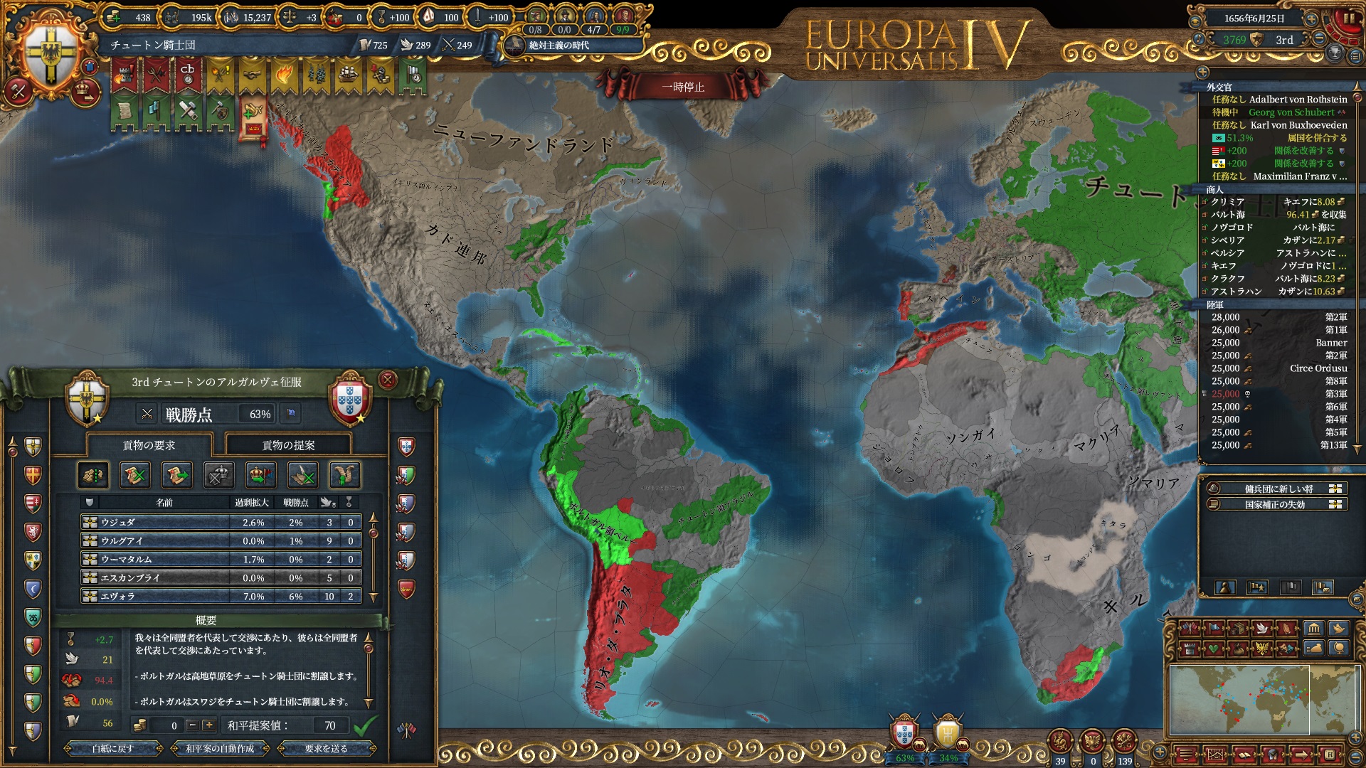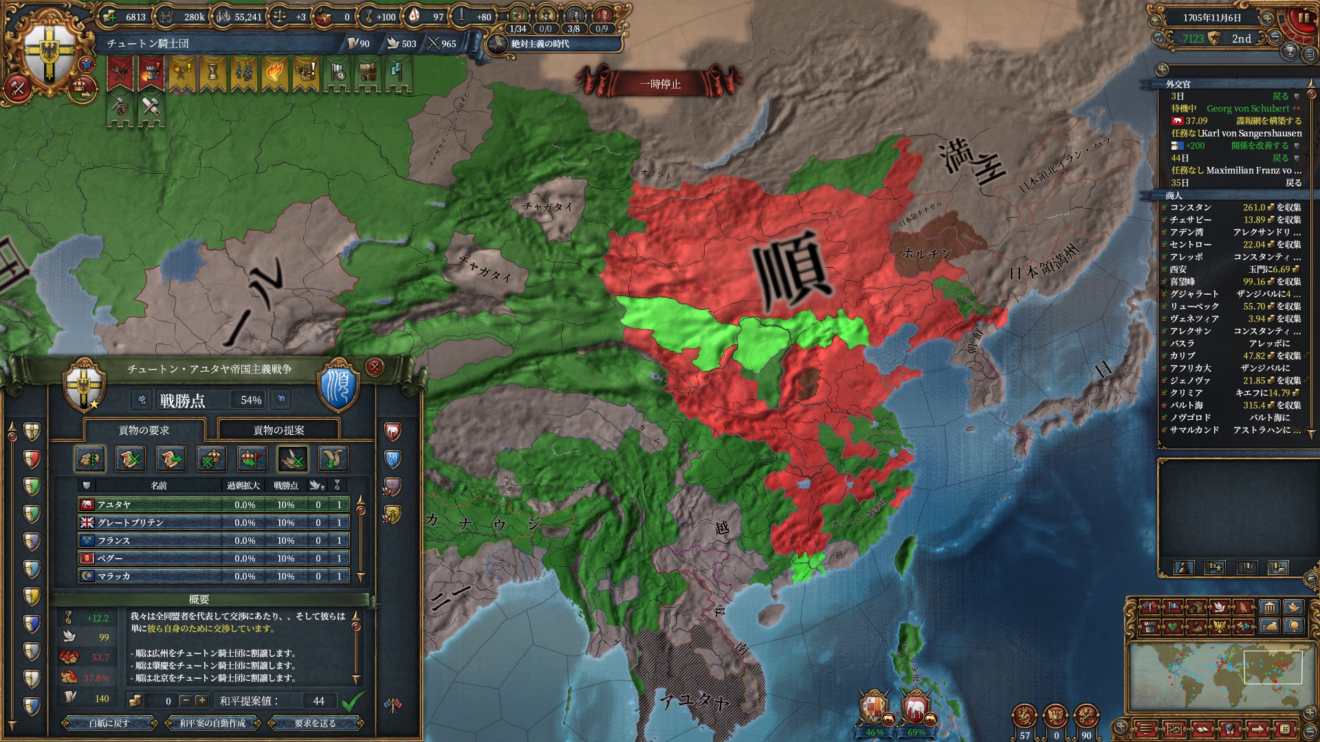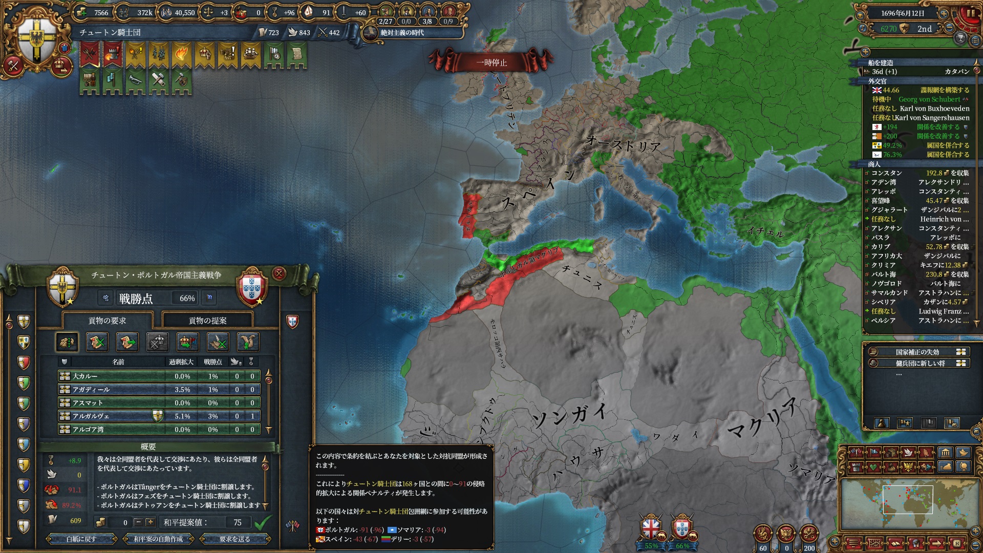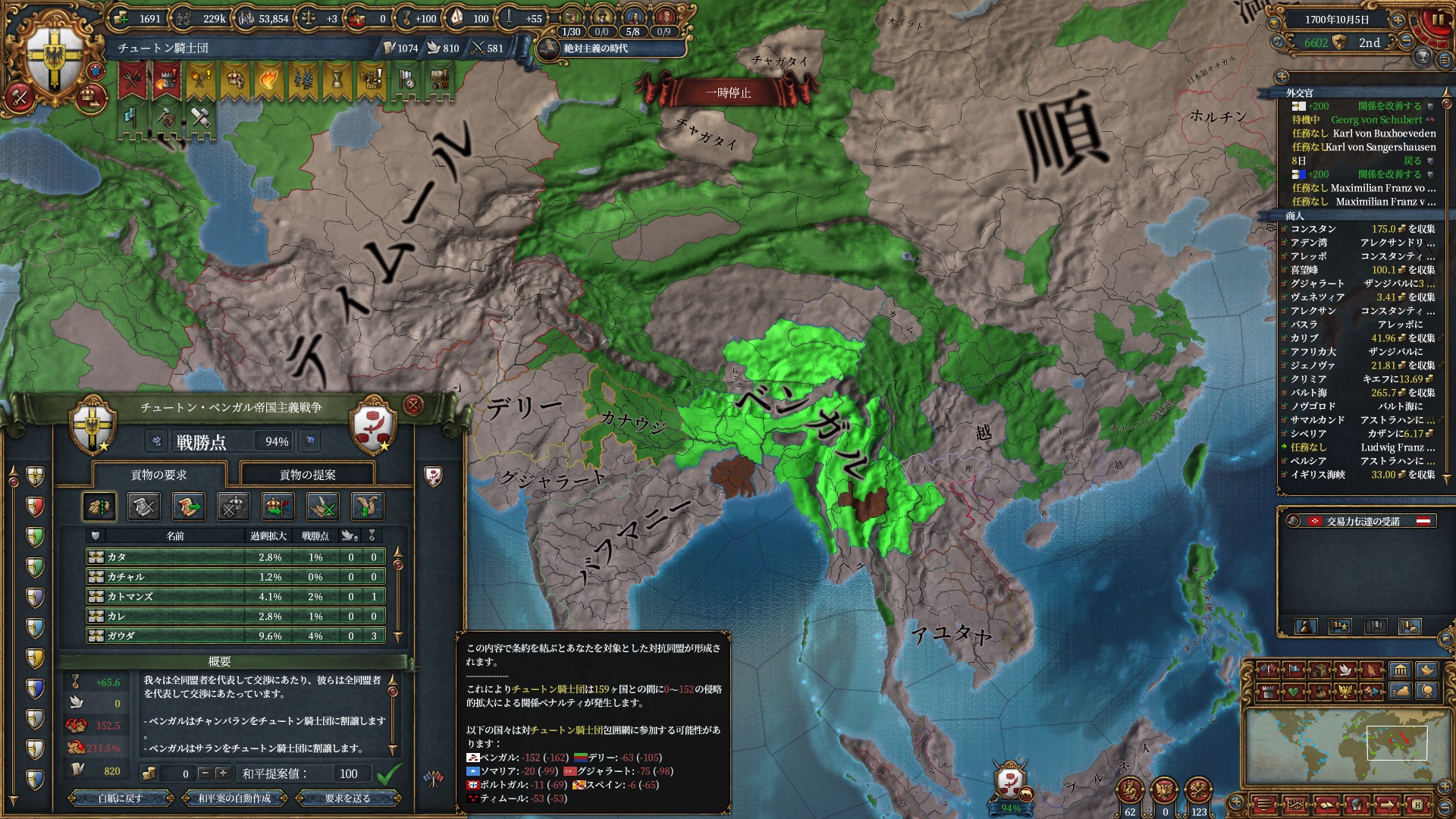 あとはOpinionが許す限り同盟を引っ張っていきますが、欧州のラスボス候補はもうおらず欧州外は宗教が異なるため一瞬で刈り取れ、少なくとも世界征服は当確といっていいでしょう。
