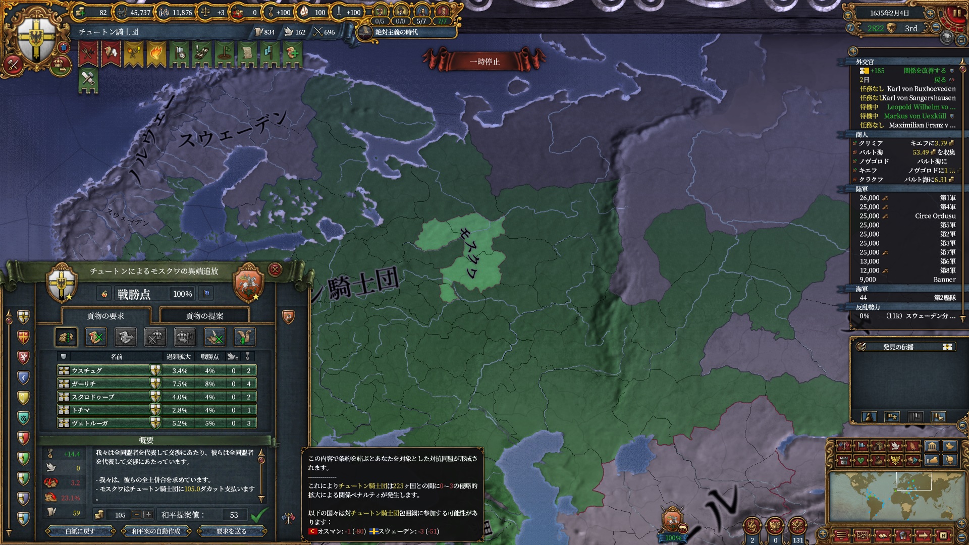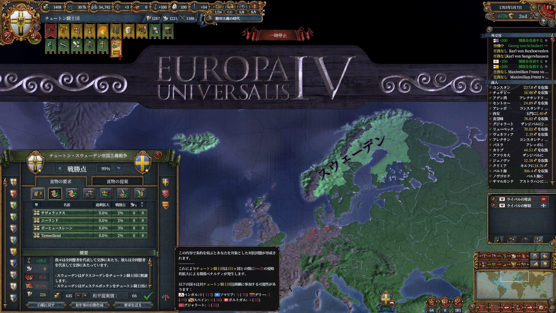 スウェーデンはCoTこそ持っていないもののバルト海ノードで地味に交易の富を得ていたので、更に奥地に追いやりました。