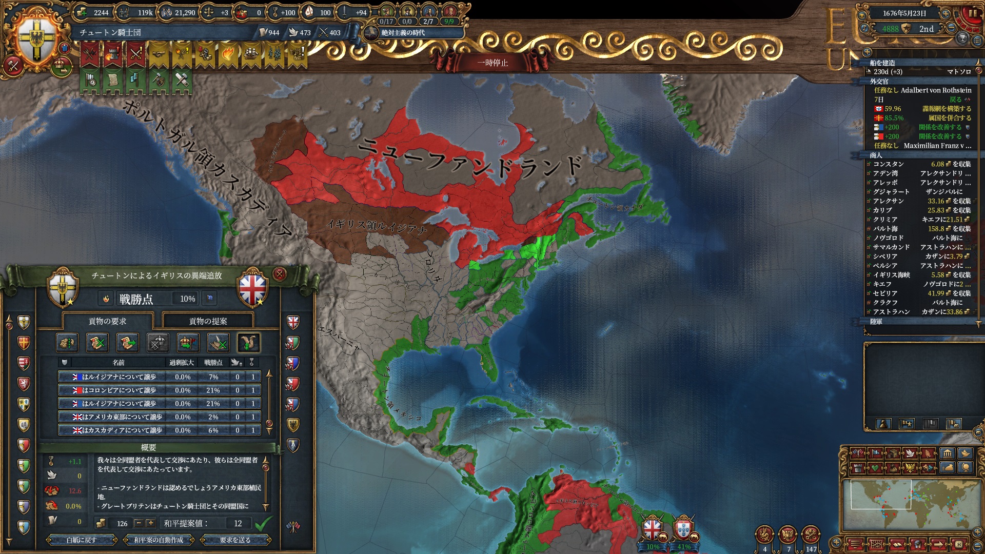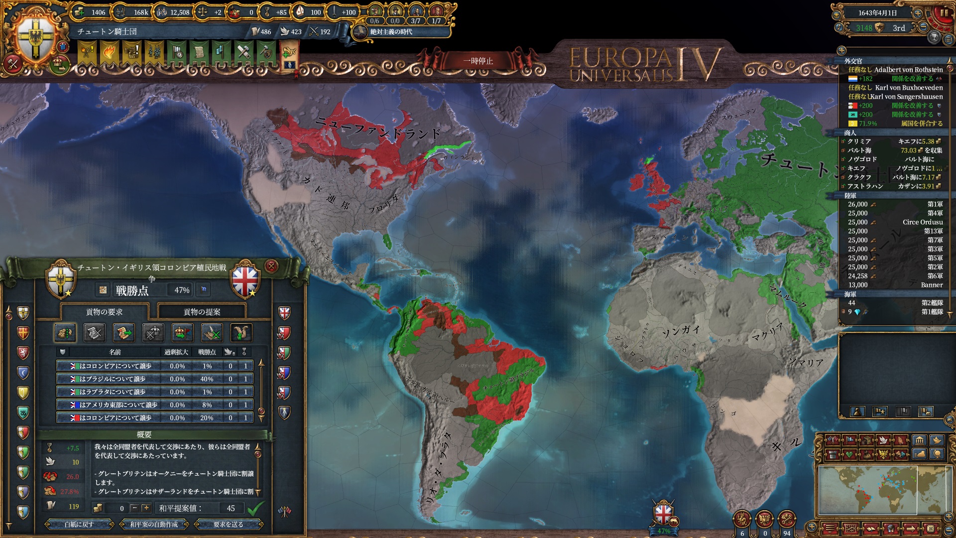 植民地国家持ちはその軍量から包囲網に入りやすく、逆にこちらの新大陸の支配域が広がるほど包囲網を無視した動きがしやすくなるので、そういった意味でも新大陸の平定は大事です。